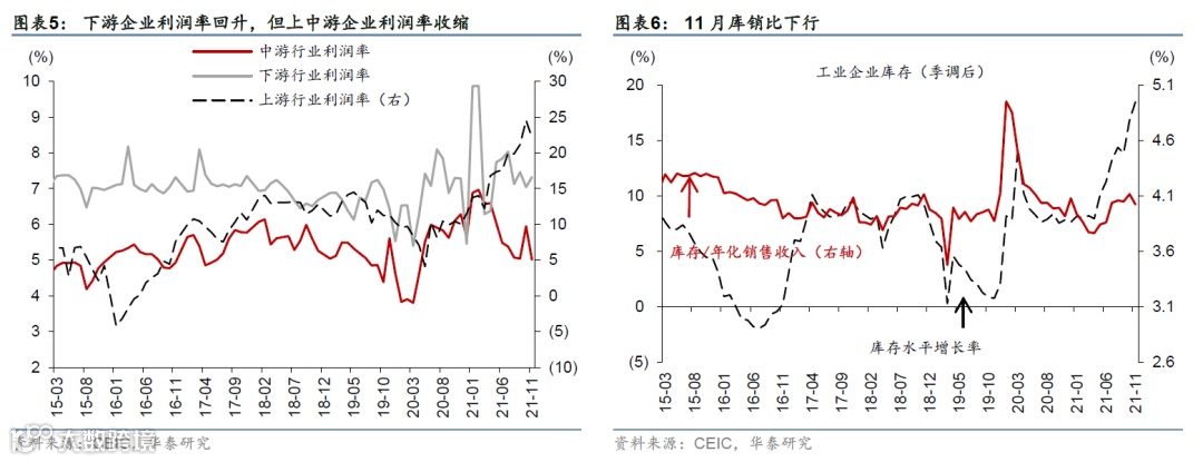 经季节性调整后,11月工业企业利润率从11月的7.3%收缩至6.4%。11月上游行业利润率为22.1%,煤炭、石油开采、化纤等行业利润率维持高位;中游行业利润率为5.0%,较10月值(5.9%)走低,其中黑色加工、仪器仪表、化工、电力生产等行业利润率下行;下游行业利润率从10月的7.0%小幅上行至7.3%(图表4和5),食品、汽车、服装、医药等行业利润率显著扩张。