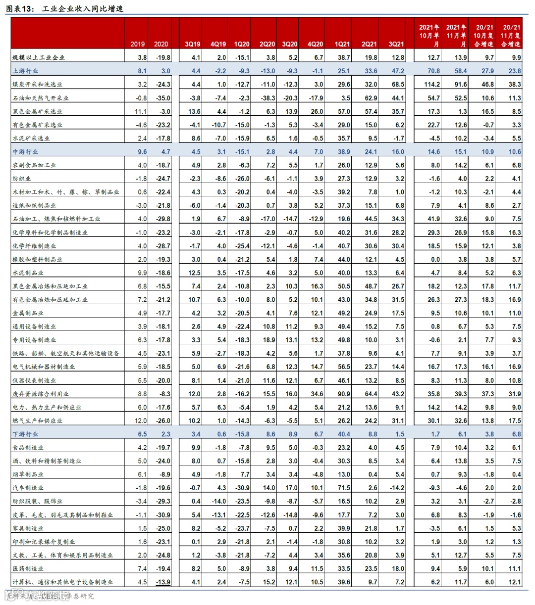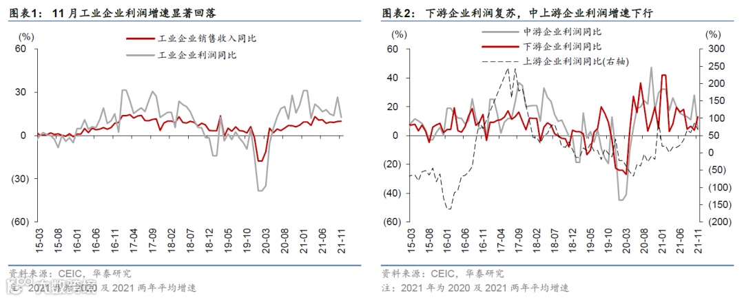2021年11月的工业利润同比增速为9.0%,两年复合增速12.5%,较10月的24.6%/26.4%显著回落。企业营收同比增长13.9%,两年复合增速为9.9%,对比10月的12.7%/9.7%(图表1)。剔除基数后,上游行业利润增速有所下行,两年复合增速从上月的85.5%下行至67.1%,中游行业利润增速承压,利润增速从上月的28.1%大幅下滑至4.7%;另一方面,下游行业利润显著回暖,利润增速从10月的3.7%反弹至13.1% (图表2)。收入方面,11月上/中/下游行业企业营收的两年复合增速分别为23.8%/10.6%/6.8%,对比10月的27.9%/10.9%/3.8%(图表3)。