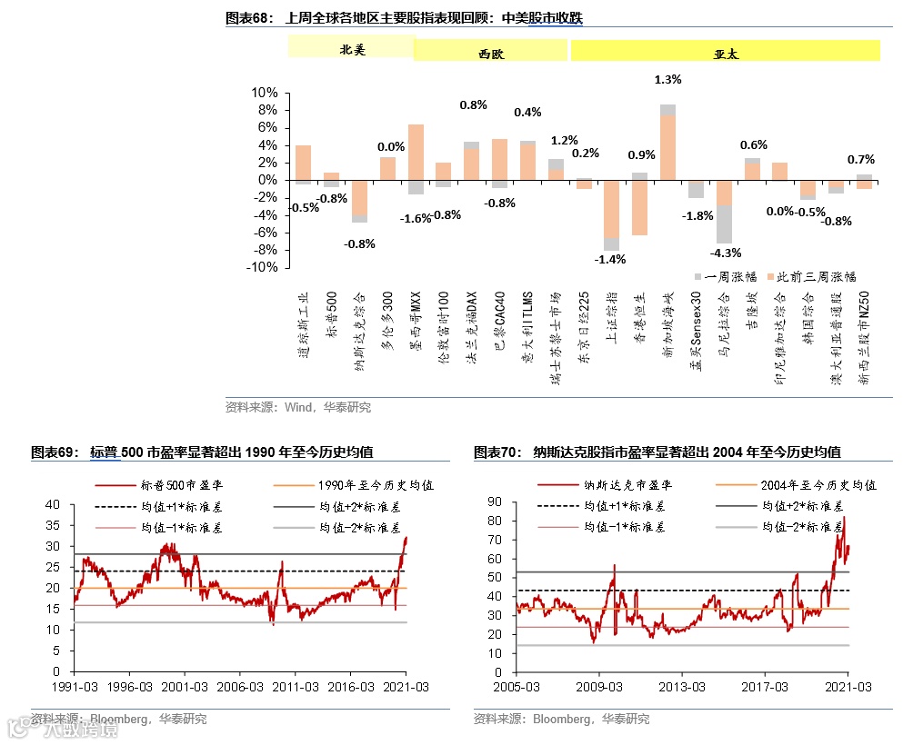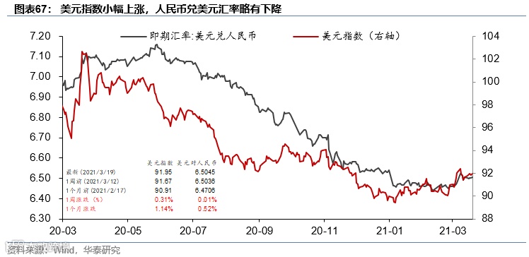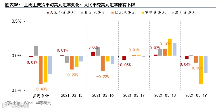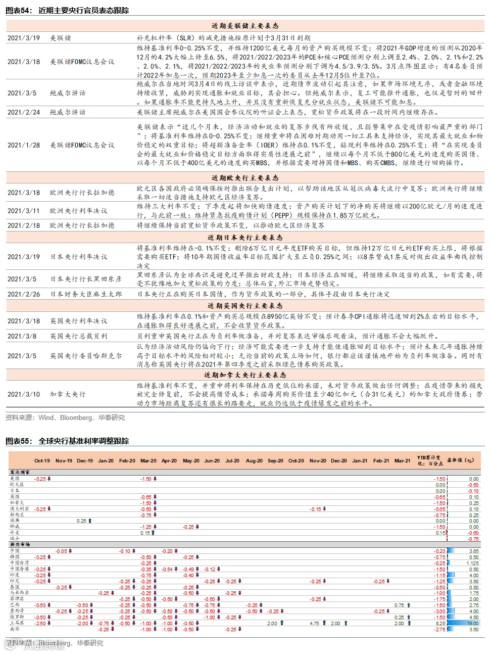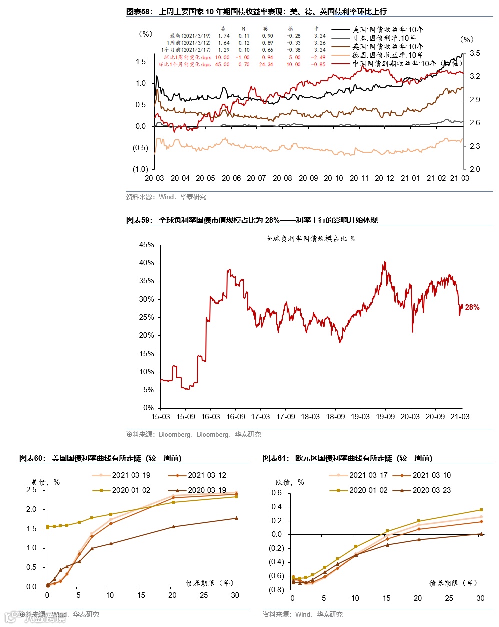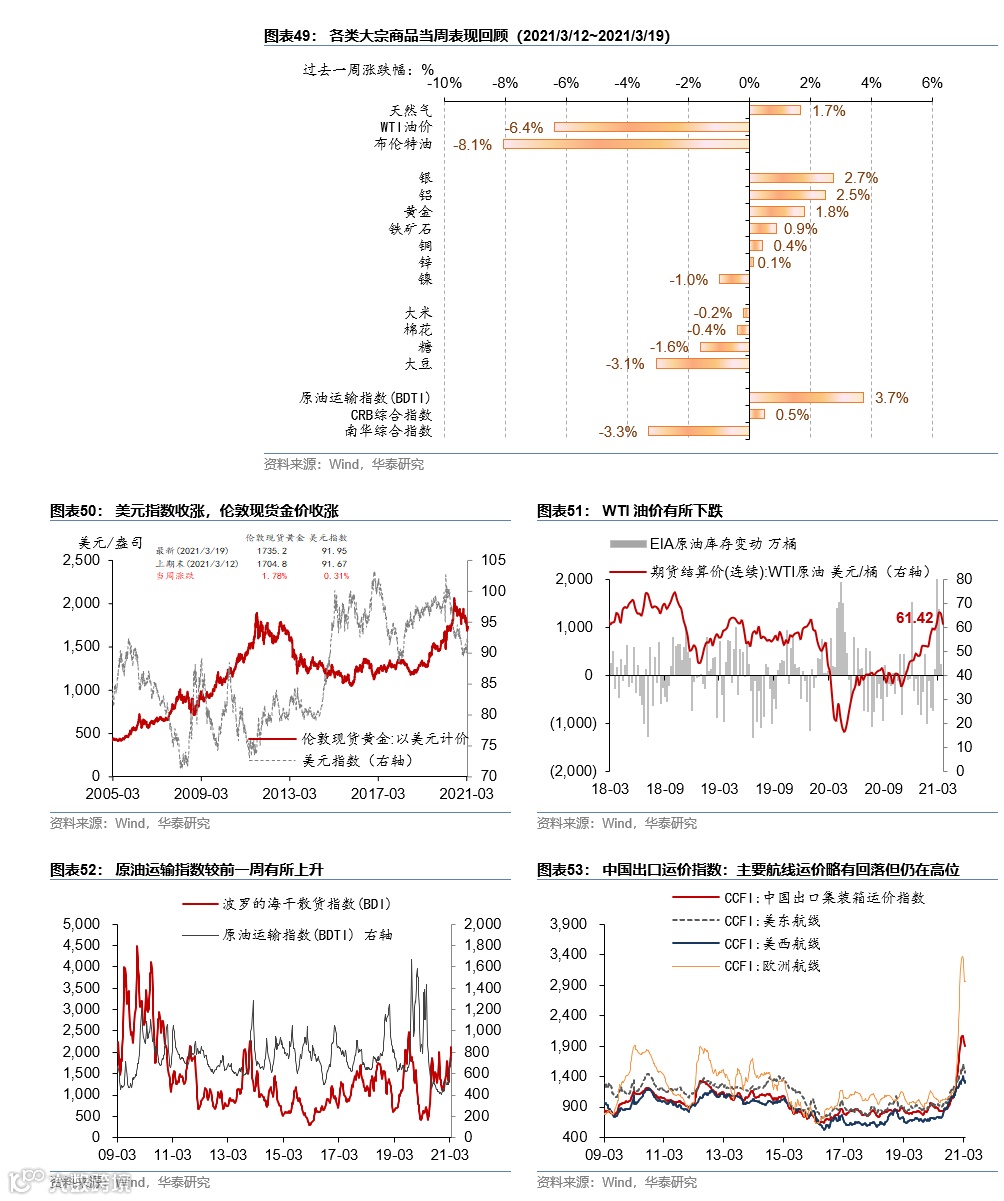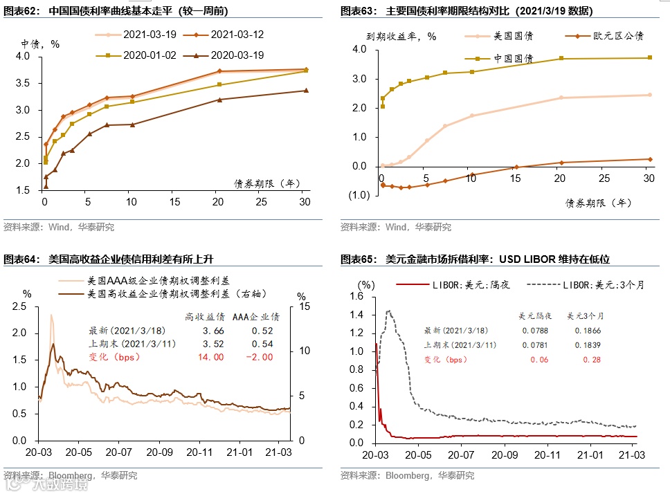 价格指标、利率和资产表现:10年期美债利率突破1.7%、真实利率跟随上行。美国和欧元区国债利率曲线走陡,随着FOMC 3月议息、以及鲍威尔宣布中止SLR豁免,美国(+10bp,1.74%)十年期国债收益率上行突破1.7%(依次为收益率一周环比变化、03/19收益率);10年期名义利率近一个月上行50bp、而实际利率则上行35bp。尽管鲍威尔重申不会过早收紧货币政策,但他暗示目前国债收益率的点位并没有造成金融条件的过度收紧、同时美债今年面临供需缺口大幅扩大的基本矛盾,2年以上期限的美债收益率短期内或继续上行。原油收跌,WTI油、布油一周跌幅分别为8.1%和6.4%;TIPS隐含各期限通胀预期基本收平。美债利率加速上行、以及中美战略会谈的不确定性等因素扰动市场情绪,中美主要股指一周均小幅收跌。