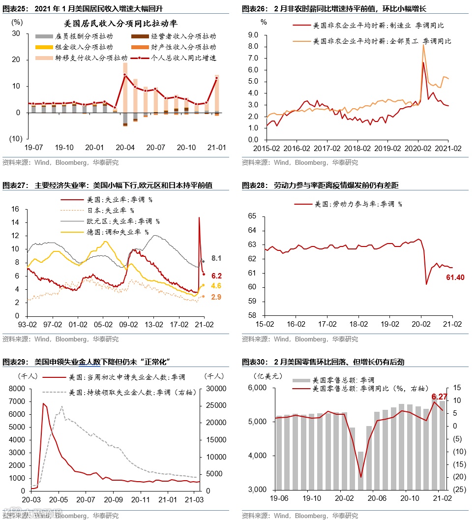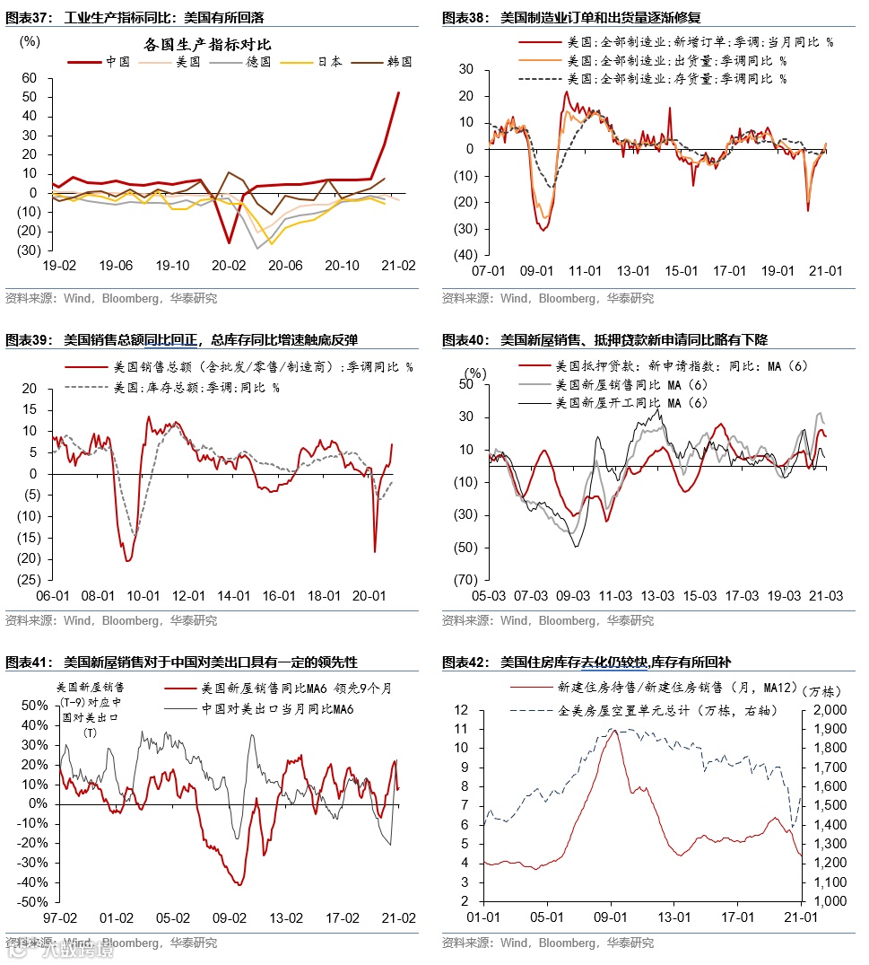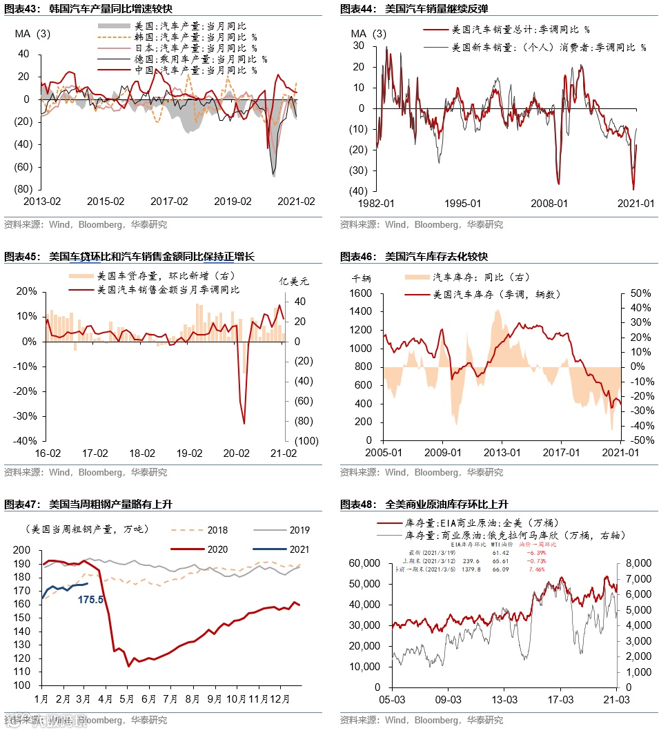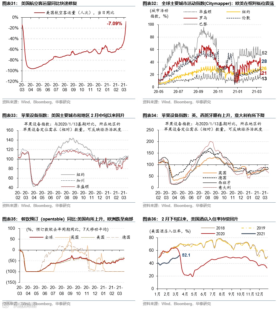 经济活动方面,整体而言服务业重启动能和弹性更大均较工业更大。美国2月份工业总产值环比回落(-2.2%)、新屋开工同比增速(-9.3%)较前值下行;但出行活动加速回暖,截至3月18日,高频数据显示美国航空客运量(人次)回升到去年1月疫情前的水平,7天移动均值同比跌幅大幅修复至-7%;酒店入住率继续上行至52%,即将超过去年同期;美国各大城市的苹果设备指数及citymapper指数均继续走强。如我们在《2月美国零售暂时回落但后劲可期》(2021/03/17)中所述,随着3月下旬第五轮更高额的财政转移支付到位,居民消费有望再次再次跳升。