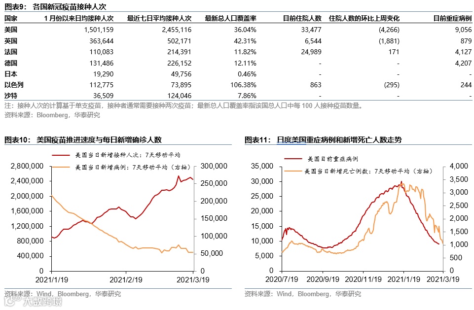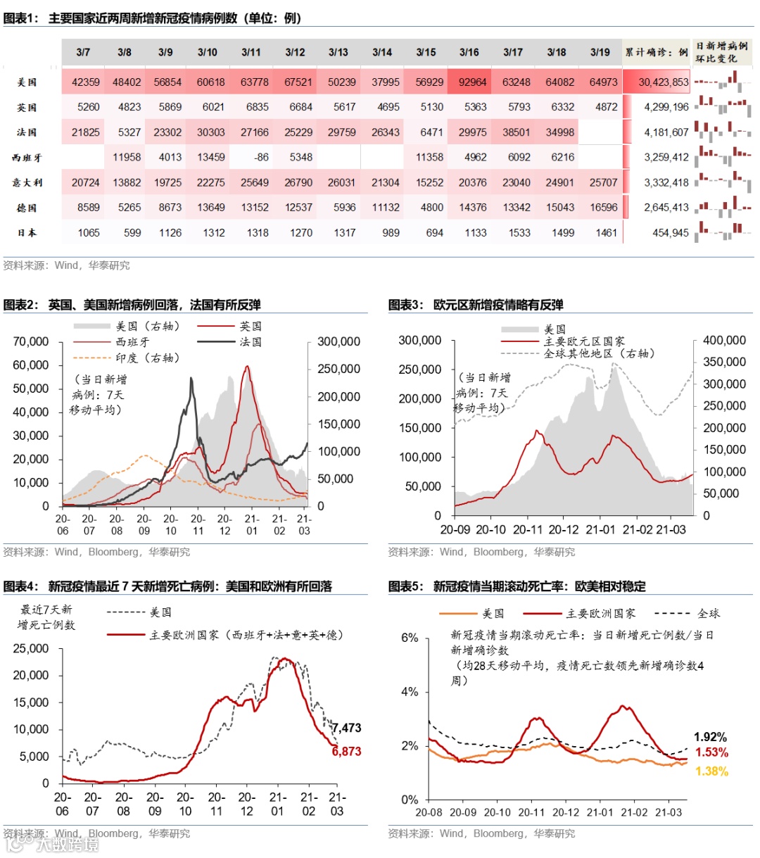 全球疫情:欧洲整体新增确诊水平基本回落到去年10月初(二次疫情爆发增长前)的水平。拜登政府计划加快疫苗接种速度、争取在上任100天内接种两亿针剂,美国、英国最新单日疫苗接种(03/19)分别为258.4万和66万剂,美国在03/13单日接种一度达457.5万剂。截至3月19日,美国(245.5万,36%)、英国(50.2万,42.3%)、法国(21.4万,11.8%)、德国(22.6万,12.1%)诸国中,英/美覆盖率已接近或超过40%(括号内依次为最近7天平均日接种剂数和总人口覆盖率)。美国(-4.3千人,-951人)、英国(-1.9千人,-313人)住院人数和重症病例继续回落(依次为住院和重症人数较前一周环比变化)。法国、德国、西班牙等疫苗接种覆盖率较低的国家,近期新增疫情仍在震荡反复,法、西等国加强封闭隔离和边境管制等防疫措施。