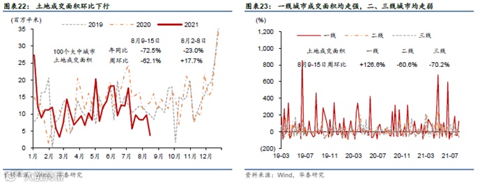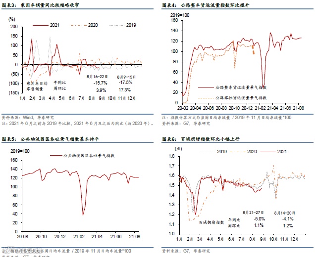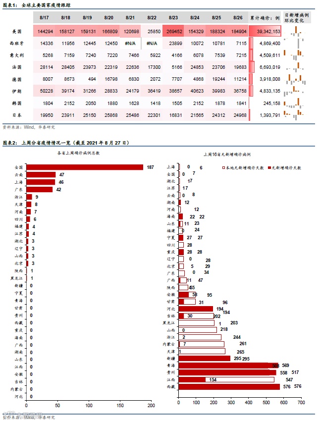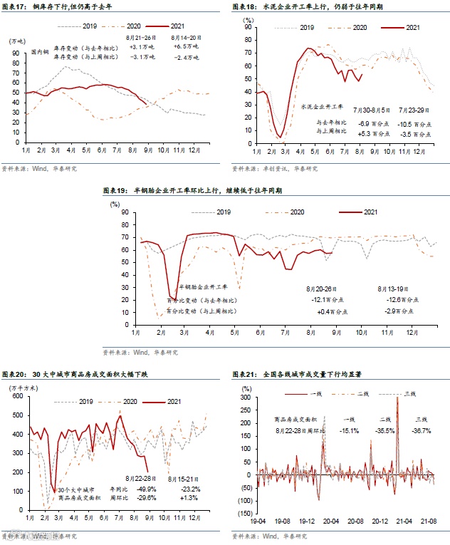 国内疫情继续缓和,服务消费温和复苏。工业生产增速加快但有分化。上周全国确诊新冠病例187例(前值 271例),环比继续下降。居民服务消费高频数据继续修复,百城拥堵指数、地铁客运量及乘用车销售等环比温和回升。另一方面,暑期临近尾声,国内航班数量及电影票房均走弱。上周焦化企业(-0.4%)开工率下行,但半钢胎企业与高炉开工率分别环比上升0.4%和0.1%,建筑钢材成交量亦大幅上升。煤炭和钢铁库存继续走低。房地产进一步大幅降温——上周商品房和土地成交面积环比均显著下降。