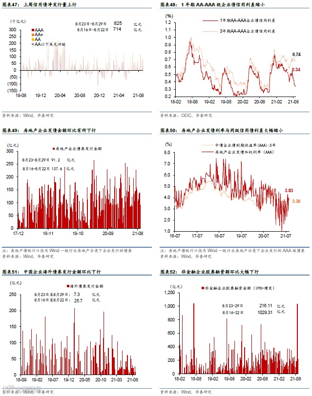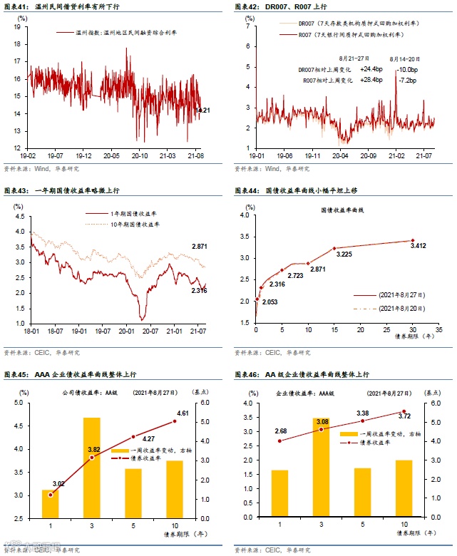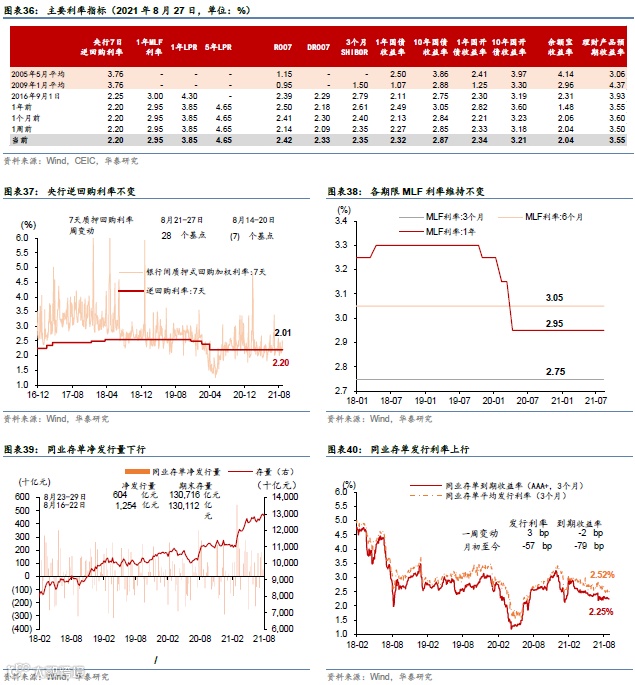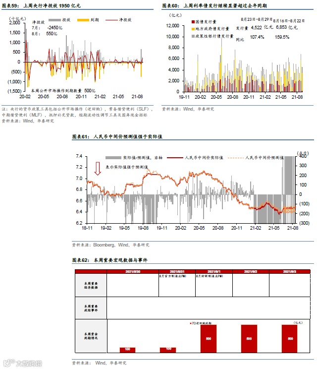 7月总体工业企业利润增速加快、收入增速略降、利润率扩张,但主要由上游行业驱动。2021年7月的工业利润两年复合增速为17.9%,较6月的16.5%略有上行;企业营收两年复合增速为8.4%,较6月的10.7%有所下行。剔除基数效应后,7月工业企业利润增速加快、收入增速略降、利润率扩张。工业原材料价格上行继续推升上游工业企业盈利,但成本上升、总需求放缓(尤其是消费放缓)压制下游盈利,且往前看盈利维持强劲的难度可能较大。8月26日,央行发文提出“保持信贷平稳增长仍需努力”,将综合运用再贷款、降准等多种货币政策工具,保持流动性合理充裕。证券时报报道,8月24日监管对六家国有大行及其理财公司做出指导,不得再存续或新发以摊余成本计量的定期开放式理财产品,且理财产品(除现金管理产品)均应优先使用市值法进行公允价值计量。