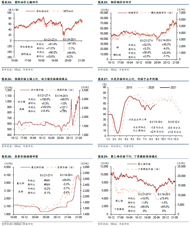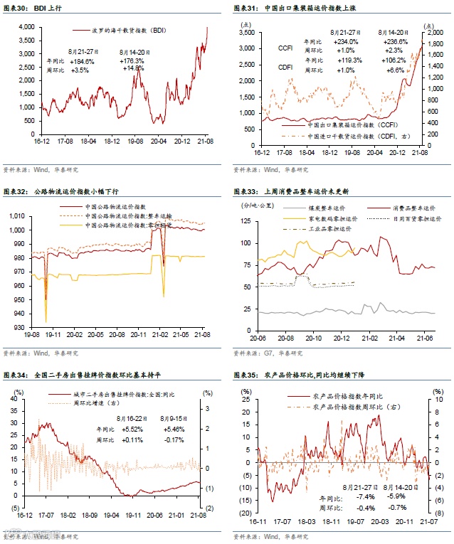 大宗商品价格反弹,出口运价维持高位,农产品价格继续下跌。上周布伦特油价反弹至72.7美元/桶附近,环比涨幅达11.5%。国内大宗商品价格,如螺纹钢(3.2%)、铜(2.5%)、动力煤(5.3%)及焦煤(15.4%)价格同样大幅上行。但中游化工品如聚乙烯(-1.8%)、尿素(-8.1%)等价格继续下降。贸易价格高位继续上行,波罗的海干散货指数进一步上升3.5%,中国出口集装箱指数同样上行1.0%。农产品价格跌幅放缓(-0.4%),但同比继续负增长。