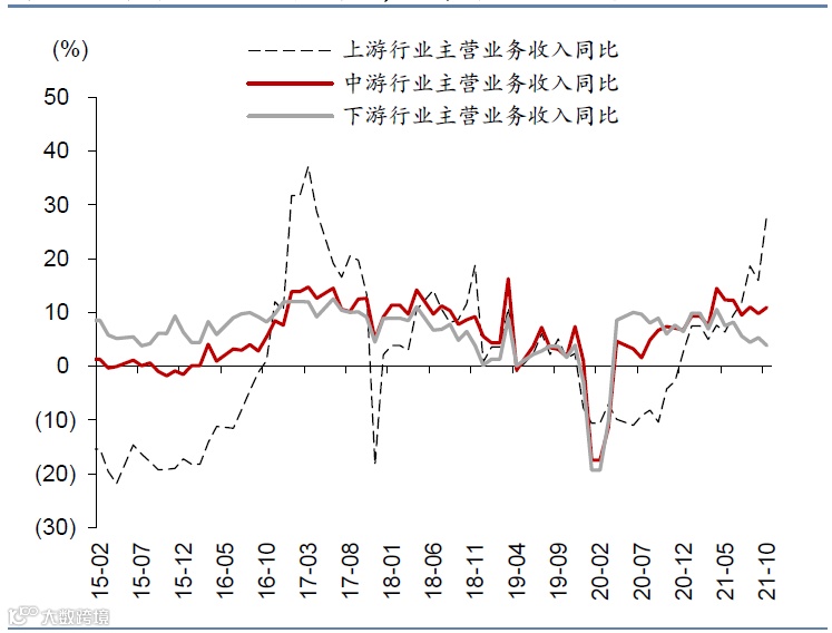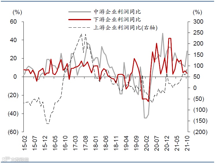 图表2:上中游企业利润增速上行,下游企业利润增速下行