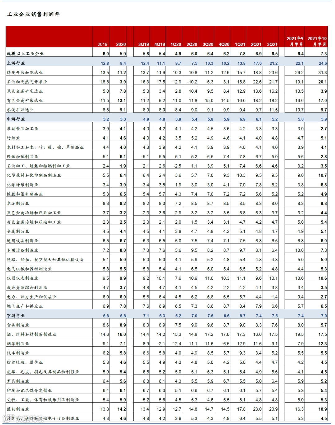 2021年10月的工业利润同比增速为24.6%,两年复合增速26.4%,较9月的16.4%/13.8%大幅上行。企业营收同比增长12.7%,两年复合增速为9.7%,较9月的11.3%/9.1%小幅加快(图表1)。剔除基数后,上游行业利润增速快速上行,两年复合增速从上月的65.3%继续上行至85.5%,主要受煤炭开采行业利润提振;中游行业利润有所改善,两年复合增速从上月的13%大幅上行至28.1%,但下游行业利润增速放缓,两年复合增速从上月的4.4%下降至3.7% (图表2)。收入方面,10月上/中/下游行业企业营收的两年复合增速分别为27.9%/10.9%/3.8%,对比9月的16.0%/9.8%/5.3%(图表3)。
