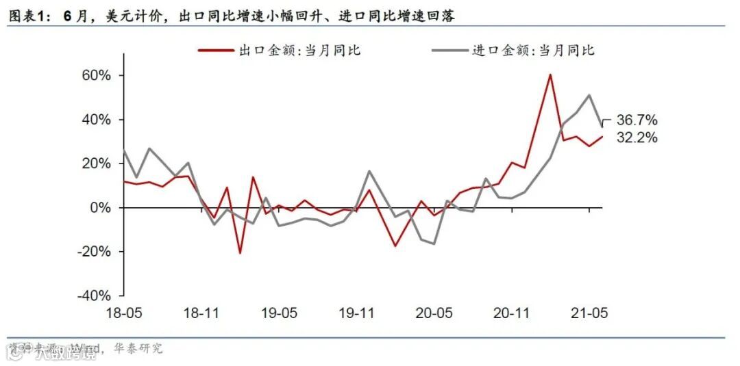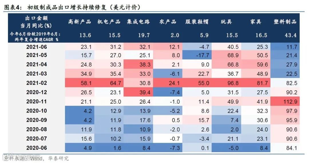 据海关总署,美元计价,今年6月我国出口同比增长+32.2%(前值+27.9%,Wind一致预期+21.4%);今年6月出口额较2019年6月两年复合增速+15.1%,较前值上行4pct;今年6月出口额是去年初至今的单月最高值。6月份对比5月份,服装鞋帽/玩具出口金额环比升幅相对最大——印证我们在《出口动能持稳;进口量价齐升》(20210607)中对我国出口产品结构逐渐向疫情前“常态”回归的判断;两年复合增速看,机电产品(+15.5%)、玩具(+15.5%)、家具(+16.5%)出口增长较为平均。