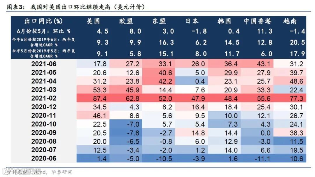 如我们在《海外: 通胀与利率的平衡依然“脆弱”》(20210531)中所述,尽管美国需求增长斜率高点或已过去,但以欧洲、日本为代表的其他发达经济体有望接棒,Q3可能是年内全球总需求环比增长高点,我国出口增长动能依然充足。其他东亚制造业国家——韩国6月出口金额为2018年10月以来最高值,相对2019年6月的两年复合增速达到12%(前值5.4%),也呈现加速态势。菲律宾、马来西亚、越南等东盟国家的经济和贸易活动仍受到变异毒株传播、疫情再度回升的扰动,我国在全球贸易份额中的占比或较为稳健。