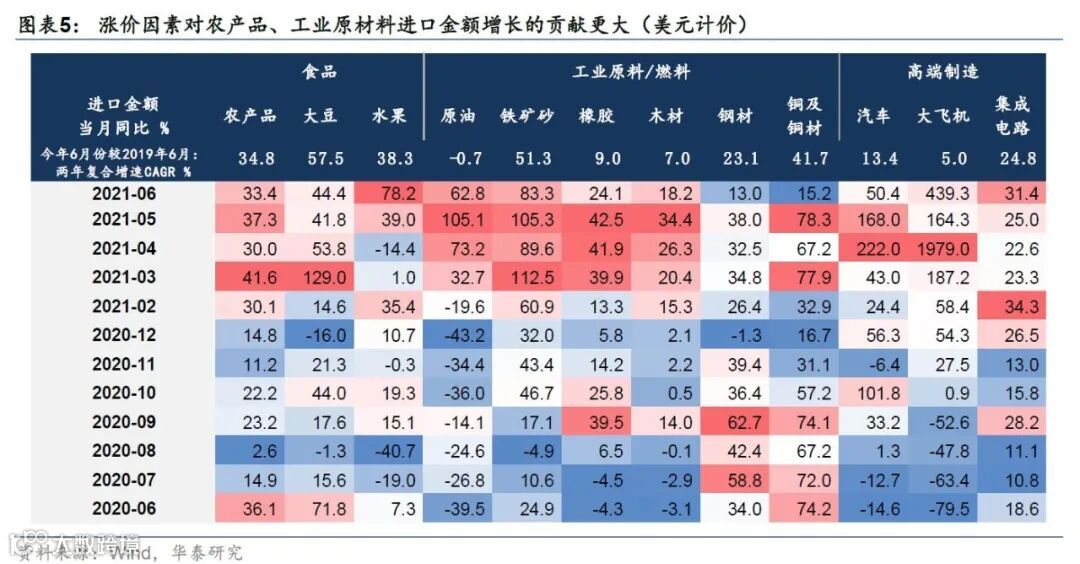 美元计价,6月我国进口同比+36.7%(前值+51.1%,Wind一致预期+26.2%);较2019年6月,两年复合增速+18.8%、较前值上行6.4pct。进口量价齐升、原材料涨价的贡献仍然较大。据海关总署,6月份农产品进口金额达到去年3月以来的最高值,其中大豆进口金额环比增幅接近20%;上半年大豆、玉米、小麦等农产品进口量价齐升。上半年进口原油(+25%)、铁矿石(+85%)金额同比增幅较大,但进口原油(-3%)、铁矿石(+2.6%)的吨数同比变动不大,主要是涨价因素带动金额上行。我国对集成电路进口需求仍然较大,6月份进口金额环比+14%、上半年累计同比接近+30%。