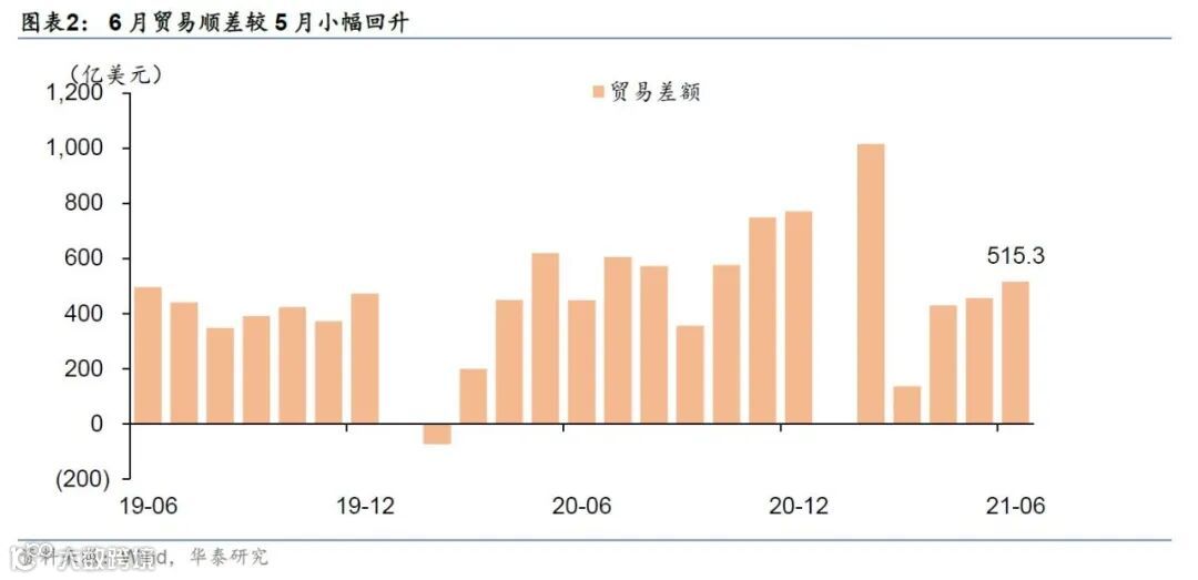 6月份我国贸易顺差515亿美元、今年Q2顺差1400亿美元(去年同期1520亿美元),上半年累计顺差2550亿美元。Q2顺差低于去年同期的主要原因是大宗商品涨价之下,进口金额升幅大于出口。分地区来看,Q2我国对美国顺差(923亿美元)较去年Q2上行120亿美元;对欧盟顺差(410亿美元)较去年Q2回落40亿美元。