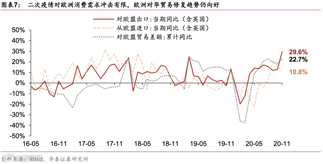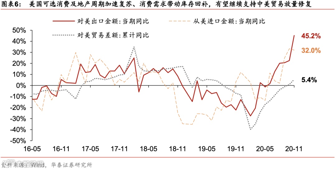 美国可选消费及地产周期加速复苏、消费需求带动库存回补,有望继续支持中美贸易放量修复。二次疫情对欧洲消费需求冲击有限,欧洲对华贸易修复趋势仍向好。11月份,中国对美国出口同比大涨45%、1-11月对美贸易差额累计同比加速回升到+5.4%(前值+0.9%)。美国家具、家电等库存水平处于近两年来的底部,而相关可选消费维持强势。疫苗有望提前量产的利好消息,对改善欧美国家居民风险偏好、支撑海外需求有积极意义。