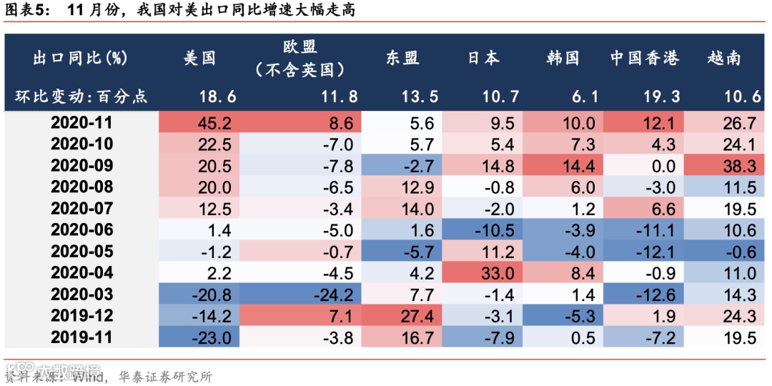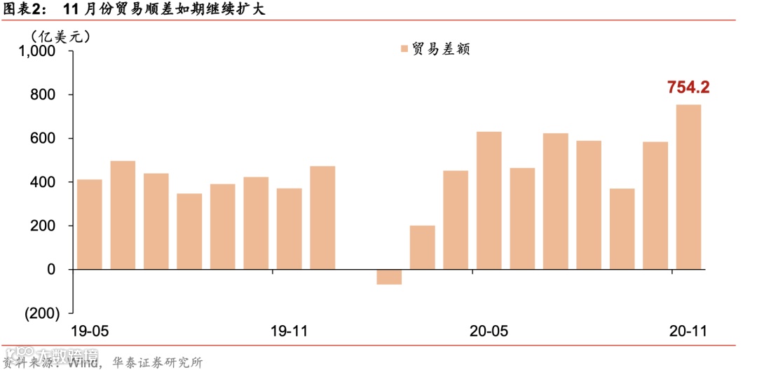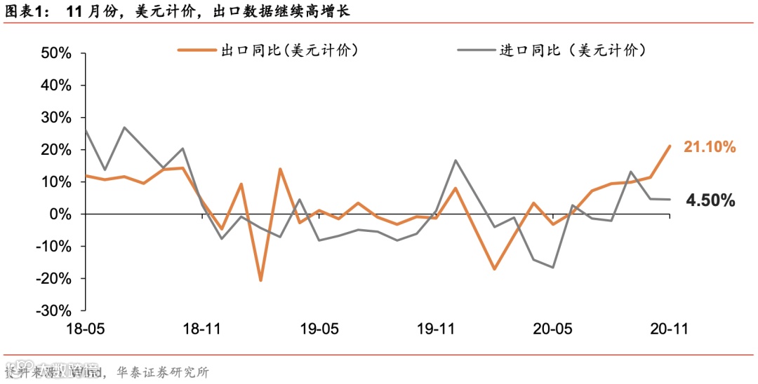 11月出口增速及顺差继续大幅上扬。11月贸易顺差754.2亿美元,是年初至今最高的一个月,Q4出口表现强势,符合我们在【华泰宏观|深度】中国出口:强者或将更强中的预期。据海关总署,美元计价,11月份出口同比增速+21.1%(前值+11.4%),进口同比+4.5%(前值+4.7%);出口增速明显高于Wind一致预期的+9.5%。今年10-11月我国贸易顺差均值为669亿美元(今年Q2为515亿美元、Q3为528亿美元,去年10-11月均值为397亿美元),贸易顺差环比、同比大幅上行,四季度出口型企业盈利增长有望明显受益。