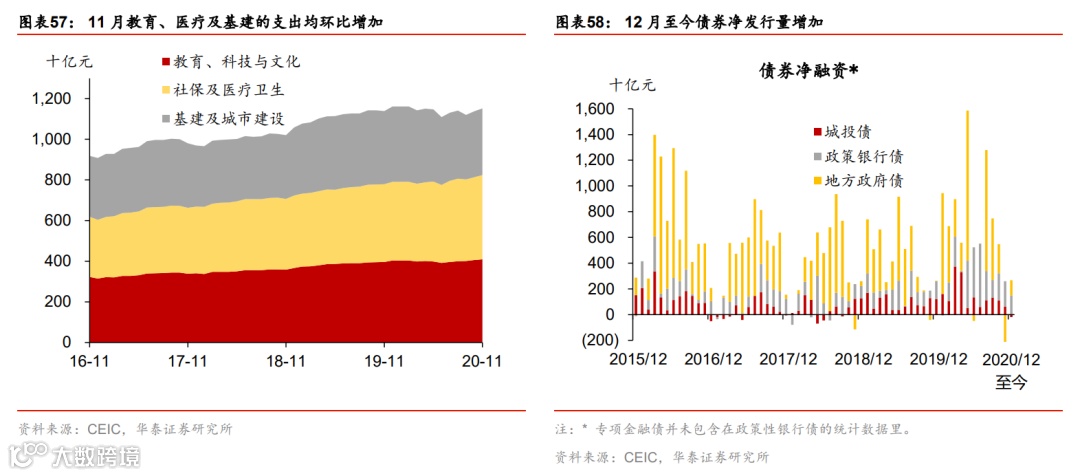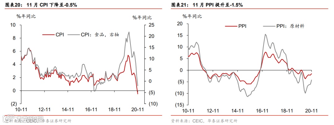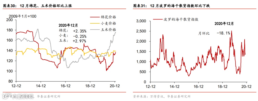 工业品价格加速上涨。12月1-29日,国际油价(布伦特:6.9%)、铜(1.7%),以及国内的螺纹钢(9.7%)、铁矿石(14.3%)、动力煤(19.4%)、化工(PTA:9.7%)等大宗商品价格的月度涨幅普遍扩大。近期中国及全球的投资需求上升、叠加局部性供给趋紧是这一轮大宗商品涨价的主要动力。由此,短期内PPI有望开始加速上扬。值得注意的是,尽管猪肉价格仍然是CPI食品的重要拖累,但玉米和大豆等主粮价格亦出现明显上涨。