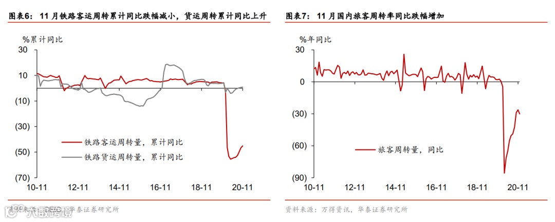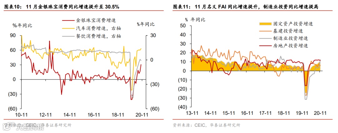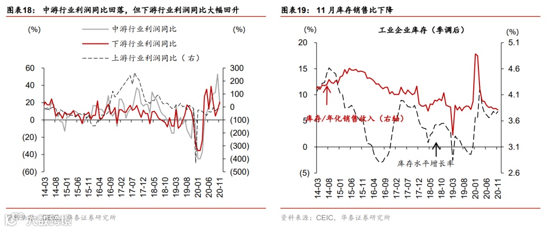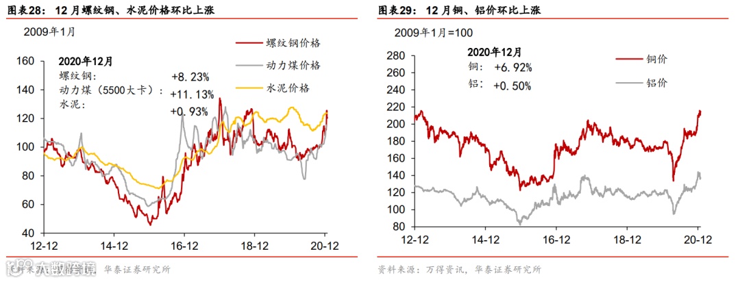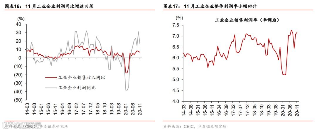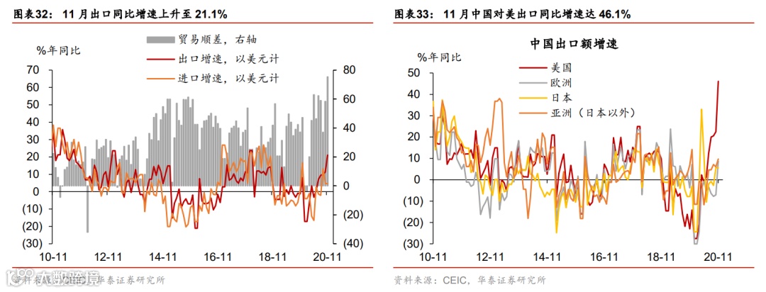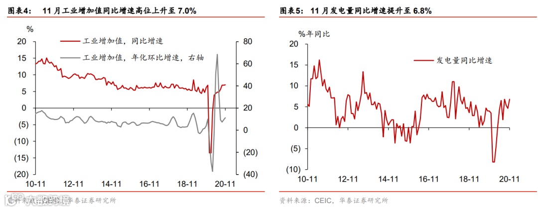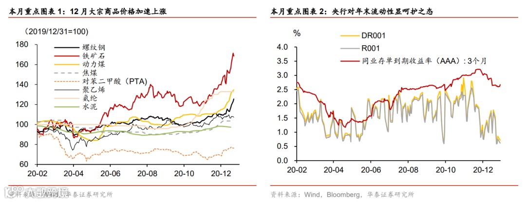 消费推动内需保持高景气度,出口有望创9年高点后再加速。12月居民消费与服务业继续回暖,暂未受到疫情小幅反弹的影响。12月1-27日,汽车零售增速亦达到10%,比11月全月的5%进一步上升。作为居民消费中的最大分项(占比10%左右),4季度以来汽车消费持续回暖推动内需增长。此外,城际间的客运(航空)及货运(铁路)活动亦趋于活跃。投资方面,12月以来中上游重工业的开工率继续下降,可能是由于天气转冷和环保限产等多方面因素影响,但另一方面,补库需求走强的态势已逐步明确。12月前两旬,中国八大主要港口的集装箱吞吐量同比增长6.5%,较11月的8%边际放缓,但出口集装箱运价指数(CCFI)继续飙升46.8%。我们预计12月出口有望再加速。