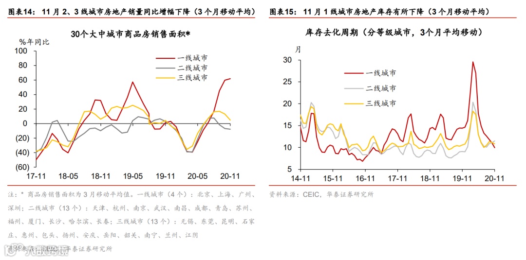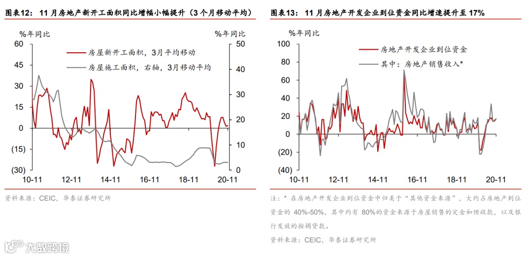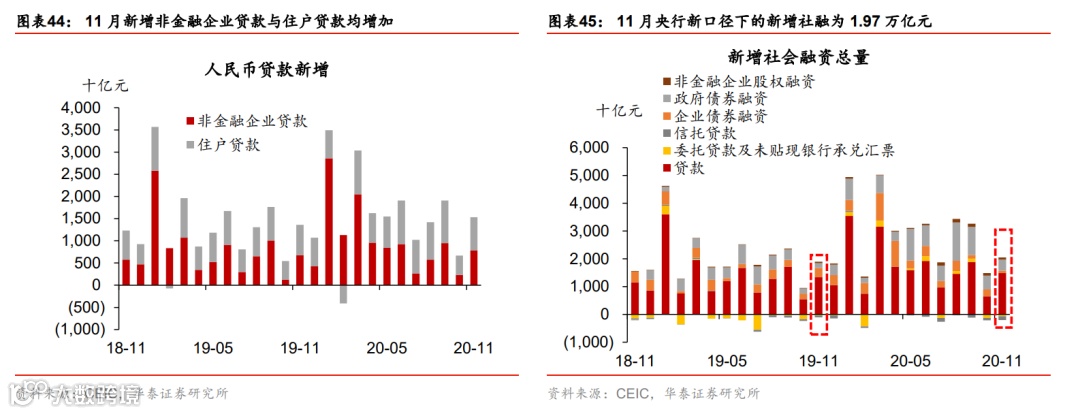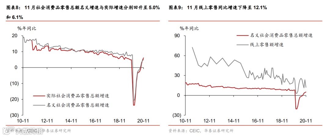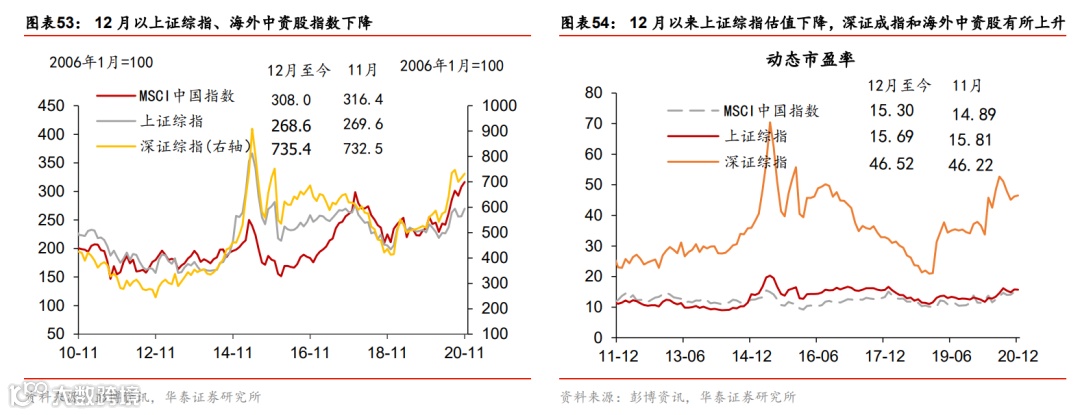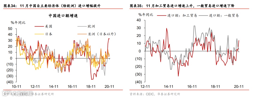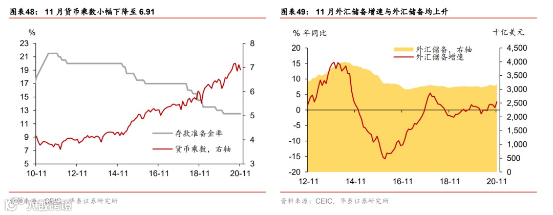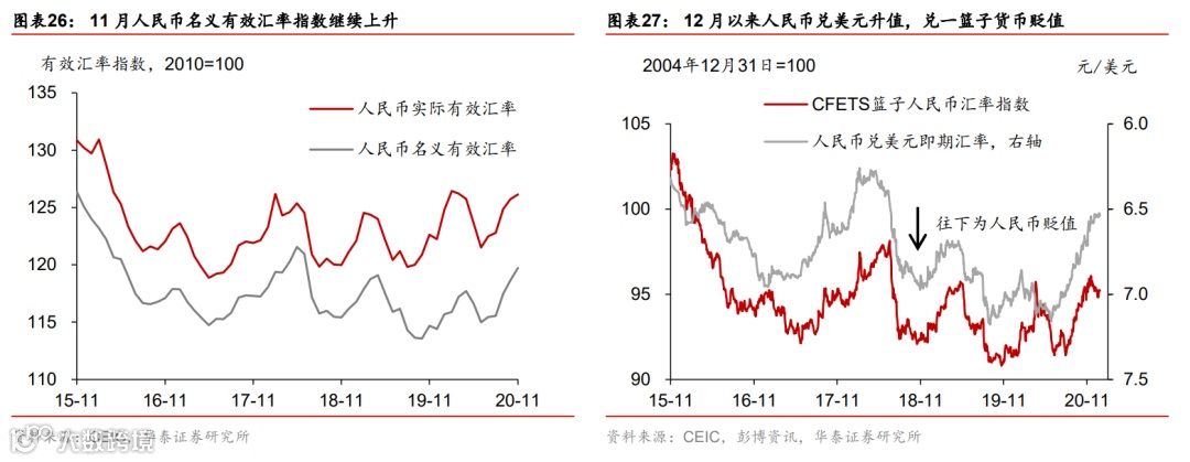 消费推动内需保持高景气度,出口有望创9年高点后再加速。12月居民消费与服务业继续回暖,暂未受到疫情小幅反弹的影响。12月1-27日,汽车零售增速亦达到10%,比11月全月的5%进一步上升。作为居民消费中的最大分项(占比10%左右),4季度以来汽车消费持续回暖推动内需增长。此外,城际间的客运(航空)及货运(铁路)活动亦趋于活跃。投资方面,12月以来中上游重工业的开工率继续下降,可能是由于天气转冷和环保限产等多方面因素影响,但另一方面,补库需求走强的态势已逐步明确。12月前两旬,中国八大主要港口的集装箱吞吐量同比增长6.5%,较11月的8%边际放缓,但出口集装箱运价指数(CCFI)继续飙升46.8%。我们预计12月出口有望再加速。