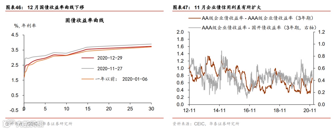 年底前货币政策边际宽松、呵护流动性,市场利率普遍回落。12月央行净投放2,400亿元,一为应对跨年资金需求,二为熨平信用风险事件后市场流动性紧张的状况。在相对宽松的货币政策下,12月短端的隔夜利率(DR001和R001)、同业存单到期收益率以及SHIBOR等利率整体回落,国债收益率曲线下移——相较上月末,10年期国债下降34bp,显示整体流动性边际宽松。但另一方面,信用分层还在继续,12月企业债净发行量仍然为负,信用利差维持高位。汇率方面,12月(截至29日)人民币兑一篮子货币有所贬值,但兑美元微升0.8%,短期内,企业结汇速度加快可能是人民币汇率的主要支撑动力。