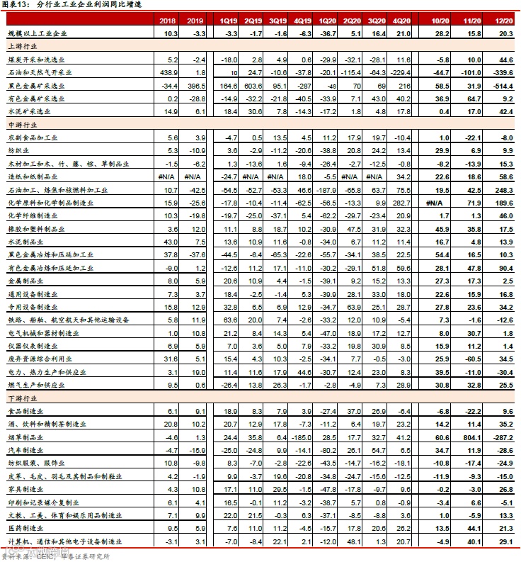 1)煤炭、黑色和水泥等上游行业利润增速加快,但石油仍是较大拖累。11月以来国内煤炭、钢铁、有色等大宗商品价格快速上涨,提振4季度上游行业利润增长。但另一方面,4季度油气开采行业利润同比仍大幅下跌。