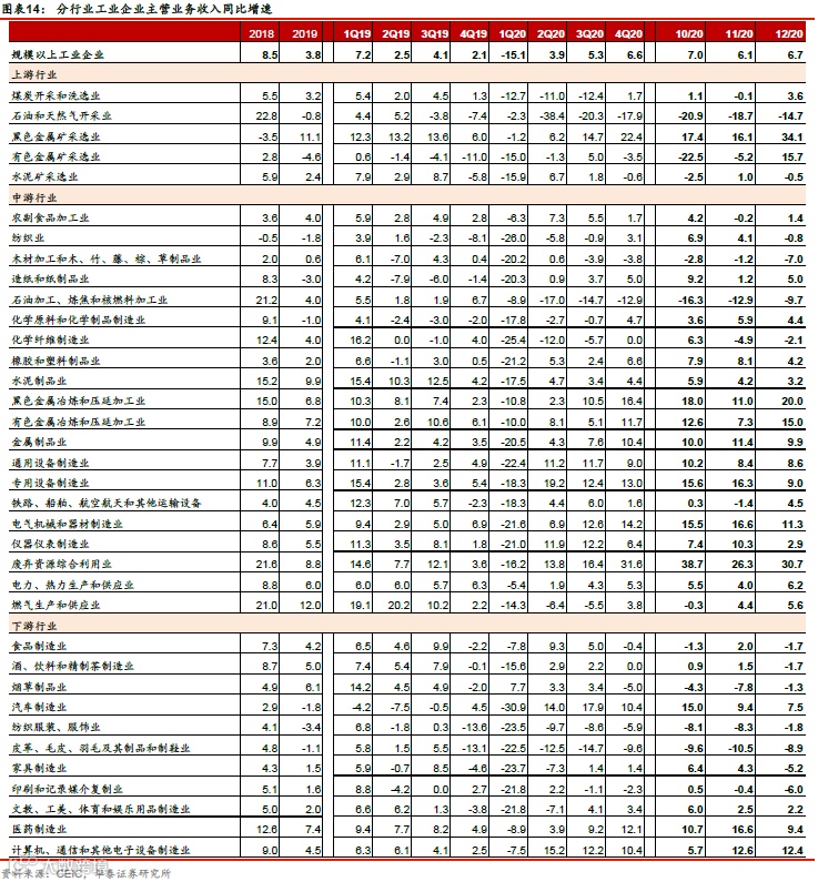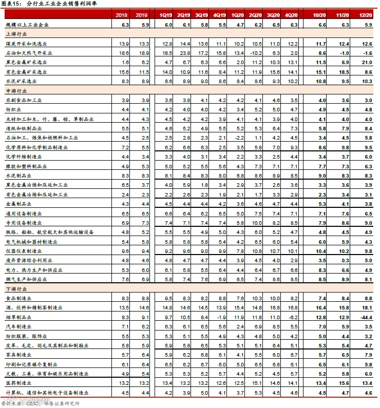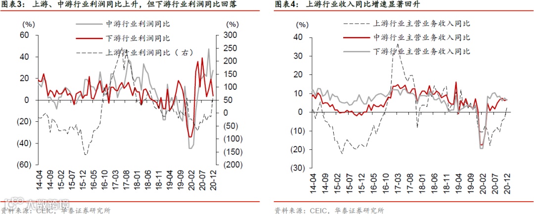 2020年4季度工业企业利润同比增速为21.0%,较3季度的16.4%进一步加快,收入同比增速从3季度的5.3%加速至6.6%(图表2)。分行业看,4季度上游利润和收入同比跌幅较3季度显著收窄,中游加速,而下游放缓。具体地,4季度上游行业利润同比下跌6.1%,较3季度下跌26.1%大幅减少,收入同比跌幅从3季度的9.5%收窄至1.5%;同时,中游行业利润和收入同比分别增长29.1%和6.8%,较3季度的22.2%和4.5%显著加速。另一方面,下游行业利润同比增速从3季度的18.3%跌至11.1%,收入同比增速从9.0%跌至6.7%(图表3和4)。
