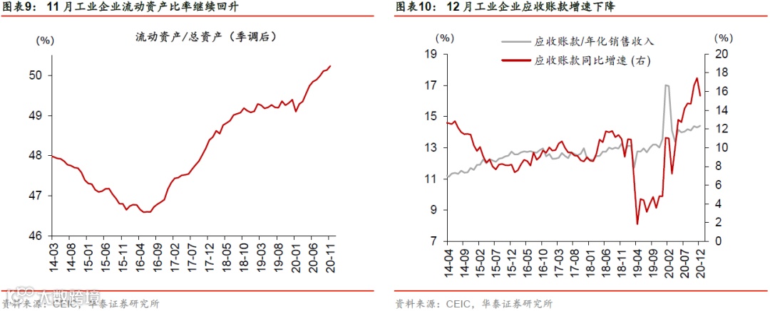 12月库存水平下降,杠杆率回落,应收账款增速下降,企业现金流可能有所好转。12月产成品库存同比增速显著下降,库存销售比基本持平。工业企业总体资产负债率下行。同时,应收账款同比增速与应收账款(与销售收入)比率有所回落(图表7-10)。