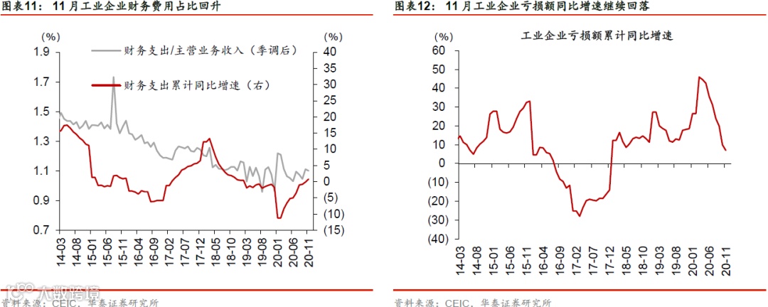 11月工业企业亏损额继续大幅收窄。财务费用收入占比回升;流动资产比率继续改善(图表9,11及12,由于12月工业企业财务费用、流动资产和亏损额数据到目前为止仍然缺失,我们将在下月工业企业财务数据点评中将这三个指标一并更新)。