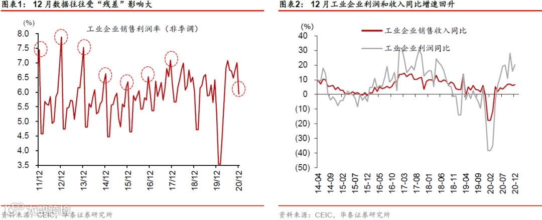 今天上午,国家统计局公布2020年全年工业企业财务数据。本篇报告我们汇总分析2020年4季度及12月工业企业盈利、收入,以及现金流等指标变化。值得提醒的是,历史上看,12月的工业企业财务数据经常明显脱离趋势(图表1),可能因为12月数据是全年终值和1-11月累计数据之间的“残差”。因此,我们重点分析4季度、淡化12月单月数据,以更好把握企业盈利实际的变化。