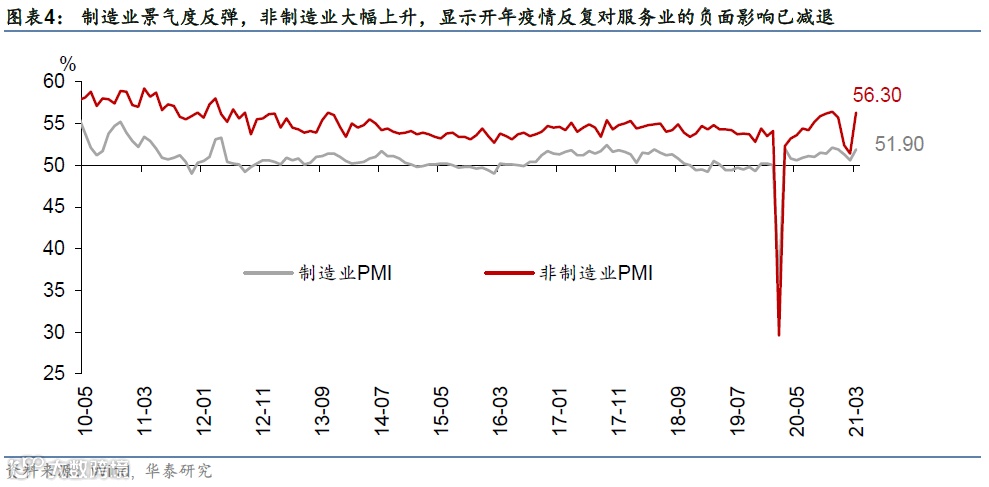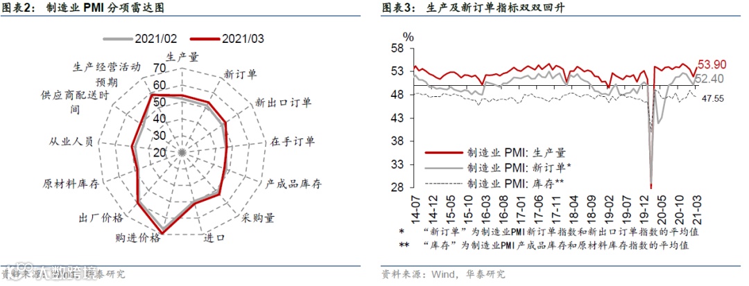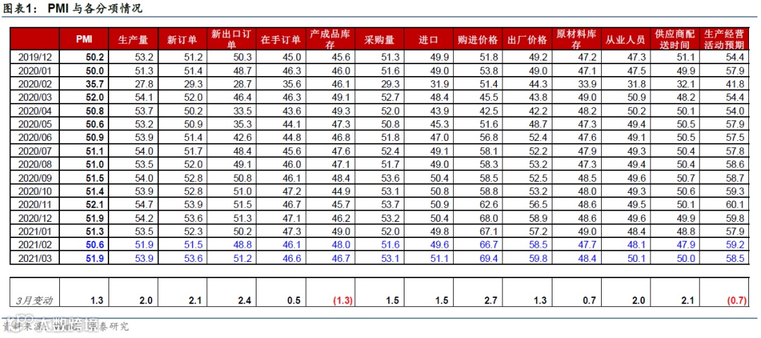 2)外需保持强劲增长势头。新出口订单指数为51.2%,较上月回升2.4个百分点。往后看,美国新一轮1.84万亿财政刺激计划可能推动其2季度增长环比显著加速,继续提振中国出口增长。