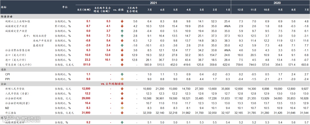我们预计,8月内外需指标均可能加速下行,尤其是居民消费可能进一步走弱。经济周期减速叠加疫情反弹的影响主要集中在8月,居民实物消费和服务消费可能双双走弱。房地产投资亦可能继续降温,但基建投资跌幅有望收窄。PPI高企、CPI基本持平。政策方面,虽然8月末加强放贷,但贷款需求走弱的背景下社融环比增速可能仅弱企稳、同比增速继续下降。