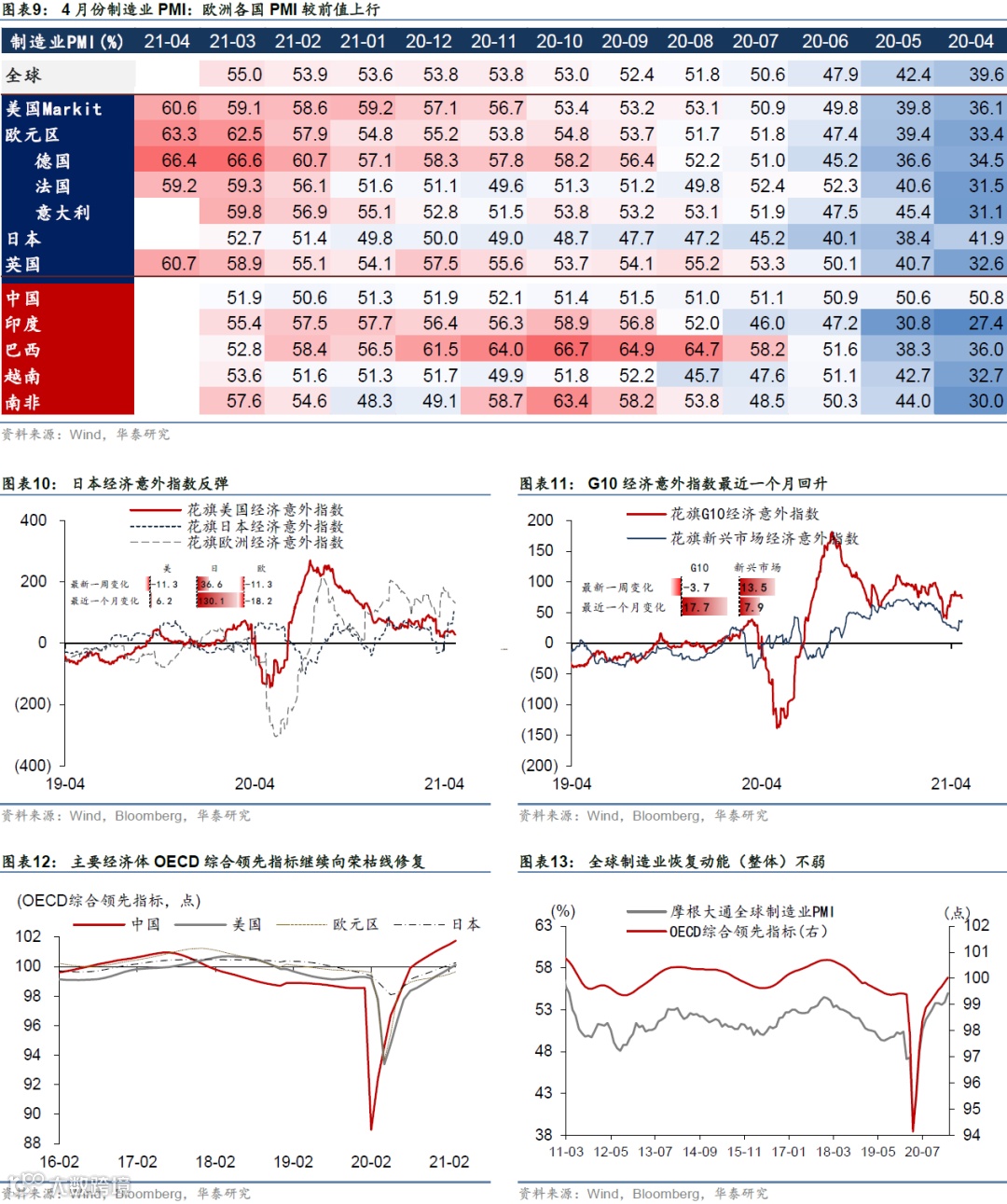 欧美制造业PMI回升到10年高位,但新一波疫情影响下新兴市场增长再次放缓。摩根大通全球(55%)3月份制造业PMI为近10年来的高位;4月Markit制造业PMI显示美国、英国预期继续改善,欧元区(63.3%)、德国(66.4%)、法国(59.2%)、英国(60.7%)、美国(60.6%)4月份制造业PMI均仍在近10年来的高位;欧元区(0.7pct)、英国(3.8pct)4月服务业PMI上行(括号内为PMI环比高于前值的百分点),欧元区服务业PMI回升至荣枯线以上。制造业和服务业先行指标均好转、制造业新订单大幅扩张。但受疫情再升级影响,以印度为代表的新兴市场经济活动再次放缓,疫苗接种在发达国家和新兴市场间“冷热不均”影响全球需求回升的整体性。