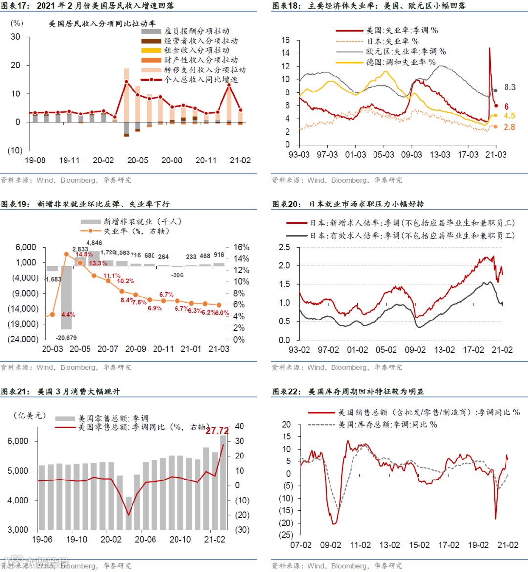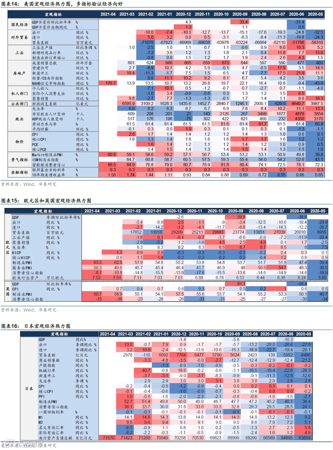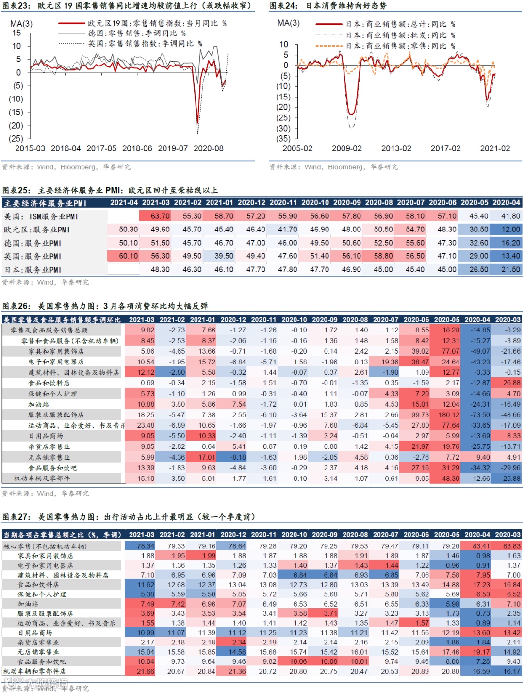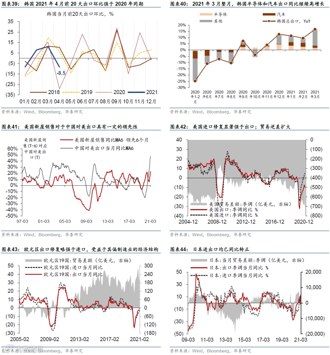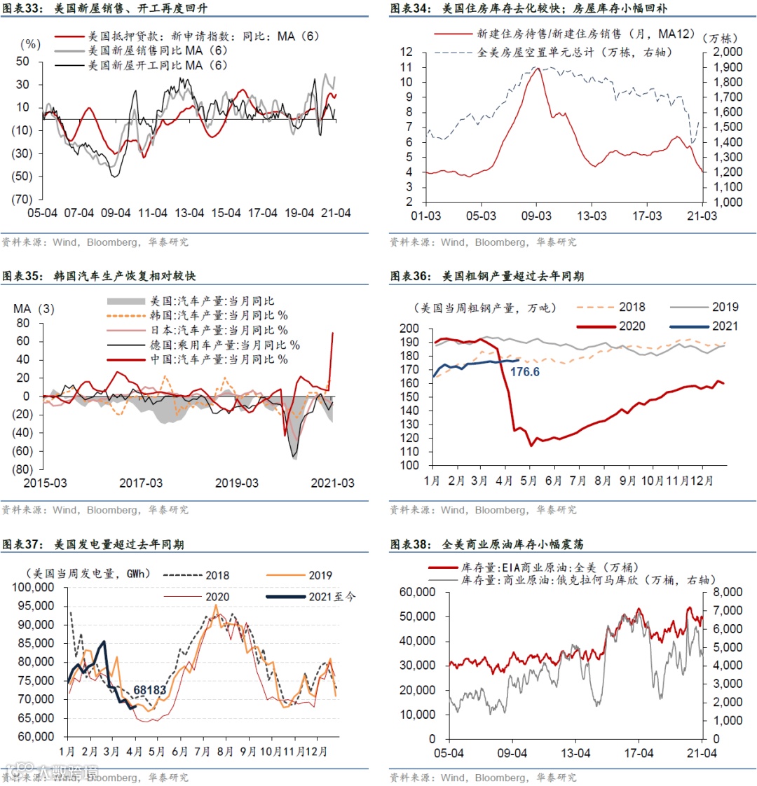 美国消费大幅跳升、经济重启下制造业订单-生产-库存均现回升;全球贸易周期扩张,但供给侧瓶颈与新兴市场复苏放缓、边际制约全球生产活动。美国居民消费已明显超过2019年同期,而欧洲消费正随着疫情缓和触底反弹。服务业消费——尤其是出行相关项目持续好转,美国和全球航空客运量较3月份继续上行。生产端,美国3月份工业生产指数同比增长自去年疫情以来首次转正,发电量、粗钢产量均已超过去年同期,3月新屋销售和开工环比、同比两个维度均大幅增长。全球制造业新签订单加速、耐用品和电子产品供不应求,同时欧美国家汽车、住房等库存仍然较低,补库暂滞后于需求增长。韩国3月份出口大增(环比+20%);在财政刺激“溢出效应”影响下,美国贸易逆差继续扩大、进口增加;欧美贸易需求和东亚制造业国家出口同步回暖。另一方面,芯片短缺困扰制造业重启、集装箱运能仍较紧张,部分新兴市场受疫情影响,经济仍重启偏慢。