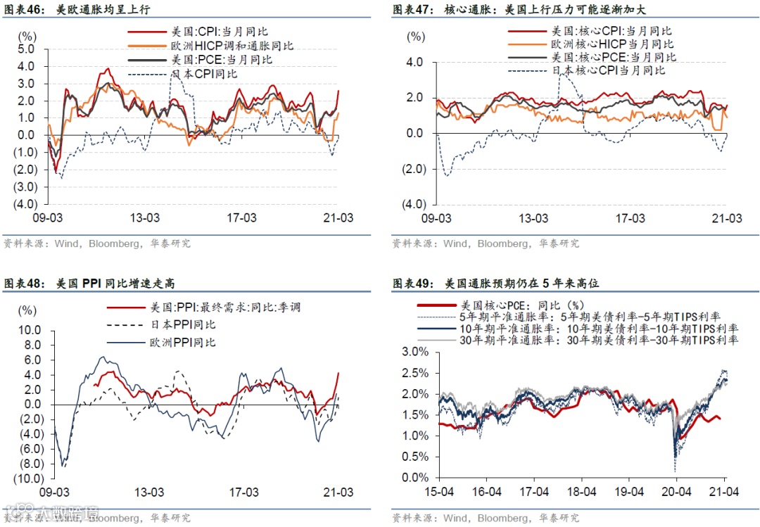 大宗商品价格重回上行、短期通胀压力再次上行。截至4月末,各期限TIPS隐含通胀预期仍在五年来的高位;4月份,原油、黑色金属、铜-铝、农产品等多类工业大宗价格重回上行通道;欧美多国房价火爆;服务业重启初期“需求>供给”、劳动力薪资水平有望持续修复;随着名义增长加速、企业盈利反弹支撑贷款需求和现金流回升,可能对资本品和劳动力成本的上行形成较强的正反馈。在1.84万亿美元纾困方案刺激下,预计从3月开始,核心PCE环比有望持续在数个月内明显强于历史季节性,今年Q2~Q4的核心PCE均值都可能高于+2%的美联储“目标线”,核心通胀的趋势和“粘性”对美联储货币政策的边际影响重要性可能继续上升。
