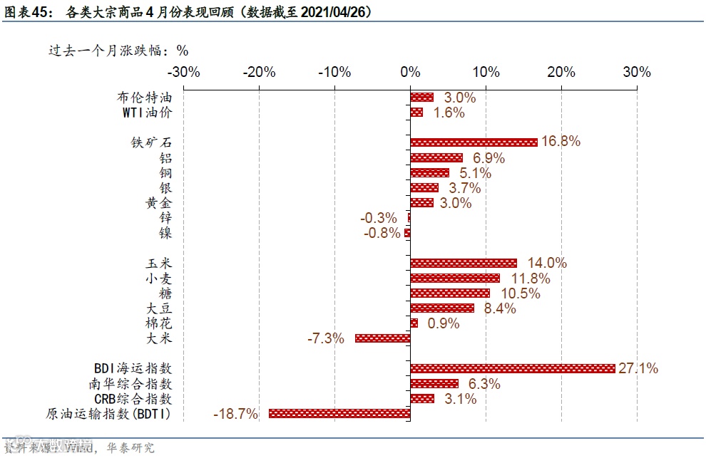 金融条件:经济转好之下,主要央行未显著加大购债力度;美欧长端国债利差收窄。美元走弱缓解全球流动性。4月份美联储、欧央行、日央行分别扩表1.2%、0.7%、0.2%;截止4月末,10年期美债利率持平于1.6%附近,4月份利率曲线小幅走平;名义利率回落+通胀预期小幅走高,4月,10/30年期美债实际利率小幅下行。在美国经济数据表现相对强势的背景下,4月份欧元区利率曲线仍然小幅走陡、美欧长债利差收窄,反映欧洲经济增长和通胀修复存在相对更大的预期差。欧元兑美元近一个月走强约3.3%,美元指数跌至91附近。