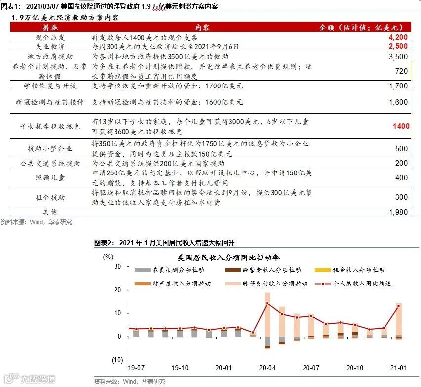 北京时间3月7日,美国参议院通过了总额1.9万亿美元的新一轮抗疫财政刺激计划;预计在下周周中前提交众议院,并在3月14日前(关于失业救助的条款到期日)由拜登正式签字通过。民主党为该项法案动用了“预算调解”,以避免陷入漫长辩论程序;相比拜登1月中旬给出的初始方案,参议院最终通过的版本中去掉了关于15美元最低时薪的内容,提高了获得现金支票的家庭收入门槛,小幅下调了失业救济金额;但1.9万亿美元的总刺激规模仍与当时提法基本一致,体现出民主党坚定推进扩张财政政策的决心。本轮刺激力度相当于我们在《美国增长或将呈“过热”之势》(2021/02/24)中所述的高端情形,美国GDP增速、居民消费、核心通胀、美债利率、财政赤字、贸易逆差也可能往我们陈述的高端情形演进。