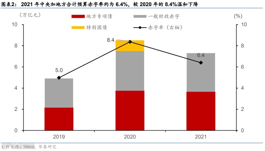 2)拟安排新增地方专项债3.65万亿元,中央和地方合计财政赤字率从2020年的8.4%下降至6.4%左右;