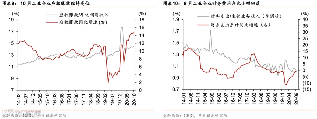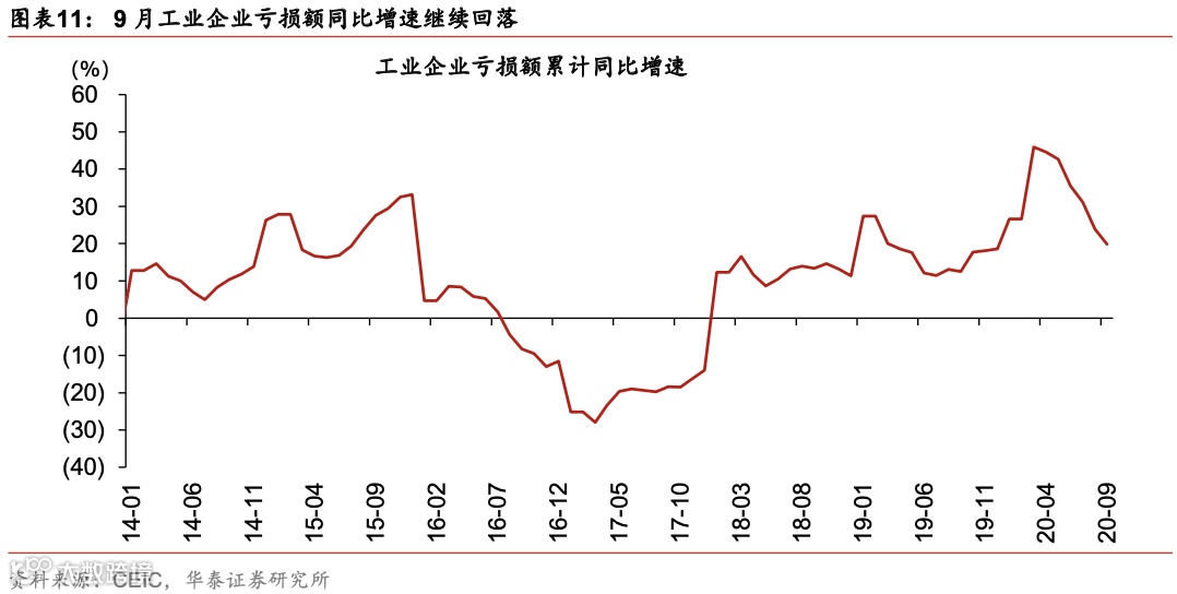 9月工业企业亏损额进一步大幅下降。财务费用收入占比小幅回落;流动资产比率继续恢复(图表8,10及11,由于10月工业企业财务费用、流动资产和亏损额数据到目前为止仍然缺失,我们将在下月工业企业财务数据点评中将这三个指标一并更新)。