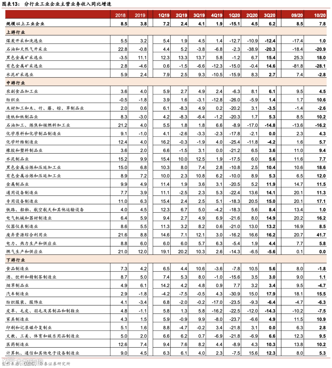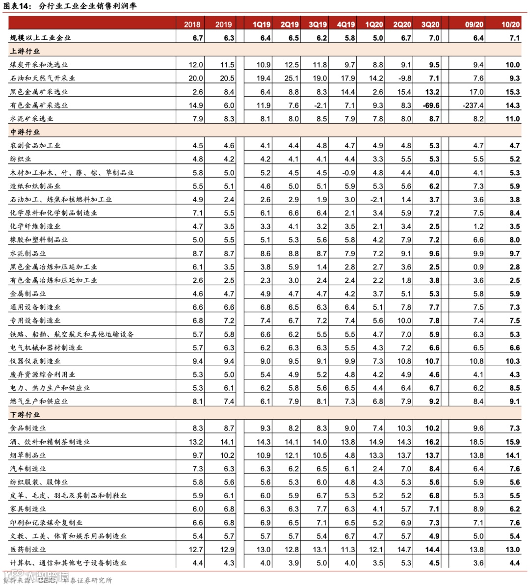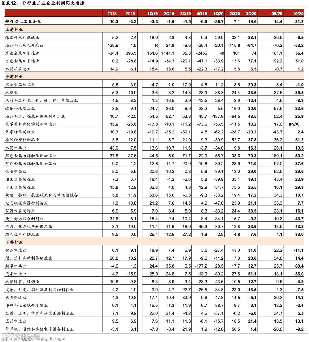 1)10月石油、煤炭等上游行业利润继续修复,化学材料行业低基数提振整体盈利。石油和天然气开采业利润同比跌幅从3季度的64.7%收窄至52.2%,煤炭开采和洗选业也从3季度的-28.1%修复至-6.5%。但从昨日发布的国企经营状况看,油气行业利润增长可能受到投资收益的一次性提振。此外,10月化学材料行业利润为572亿元,而去年同期基数极低,为亏损151亿元,对整体利润增长贡献较大。