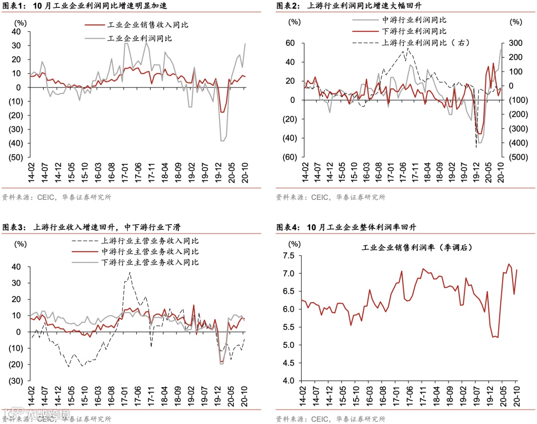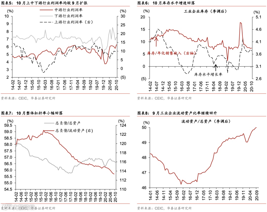 10月官报工业企业利润同比增速从9月的10.1%回升至28.2%,与3季度总体同比增速19.6%相比也有所提升(图表1)。利润增速加快部分受低基数和投资收益增加提振,但也反映出企业盈利继续向好。10月上游行业利润同比跌幅从3季度的24.7%缩小至14.0%;中游行业利润增速大幅加快,同比增长52.9%,对比3季度的27.2%;下游行业利润同比增速略有放缓,从3季度的21.1%下降至11.5%,但汽车和计算机行业盈利保持高增长(图表2,图表12-14)。