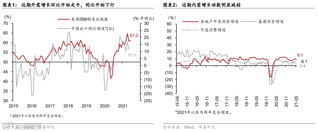 如我们在2021年下半年中期策略报告中所阐述的,我们认为下半年宏观政策可能边际宽松(参见5月30日发布的《通胀传导可控,宏观政策“被动”调整》)。但总体基调可能仍是“托而不举”。概括和更新我们中期报告中的观点,以下宏观层面的变化可能促使下半年政策倾向边际宽松——1)外需增长环比开始走平,同比开始下行,4月30日政治局会议提出的“稳增长形势较好的窗口期”在过去(图表1);2)历经(2020年4季度起)三个季度的政策紧缩/退出,内需增长动能明显减弱,包括地产、基建投资、可选消费等指标(图表2)。而政府在这一层面的共识也逐步形成;3)由于内需总体动能减弱,对上游通胀传导的担忧在退潮,而原材料价格上涨及供给瓶颈对利润、需求和产能利用率的挤压效应日益显现(参见5月13日发布的《PPI上涨周期中的“赢家”与“输家”》)。