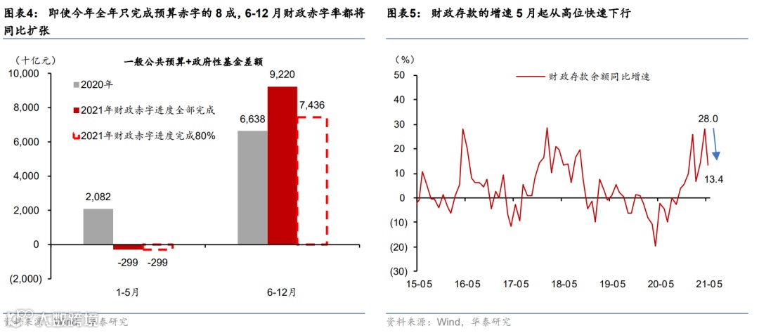 首先,我们认为月度财政收入-支出赤字的变化(同比少减或者多增)是衡量财政是否开始发力的重要指标——这一指标2021年1-4月累计收缩2.2万亿人民币左右、对应年化6-7%的财政赤字率收缩,5月收缩幅度有所收窄,但1-5月仍累计收缩近2.4万亿人民币 (图表3)。往前看,即使今年全年只完成预算赤字的8成(历史范围低端),6-12月财政赤字率都将同比扩张、与1-4月大幅收缩形成鲜明对比(图表4)。同时,财政存款同比增长的变化(同比加速理解为紧缩)也是验证财政政策对实体经济支持力度变化的侧面指标——图表5显示财政存款的增速5月起也从之前的高位快速下行,对货币供应及社会融资的边际挤压效应开始消退(具体机制请参见“问题4”)
