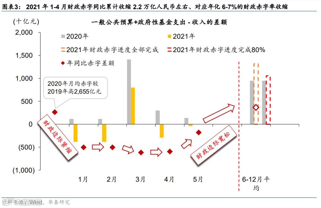 此外,2020年特殊的基数原因导致财政政策在2021年上半年大概率明显紧缩、尤其是1-4月——如我们在此前中期策略报告中所预测的,政策最紧的时候会在5月过去。
