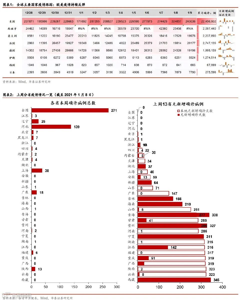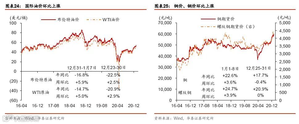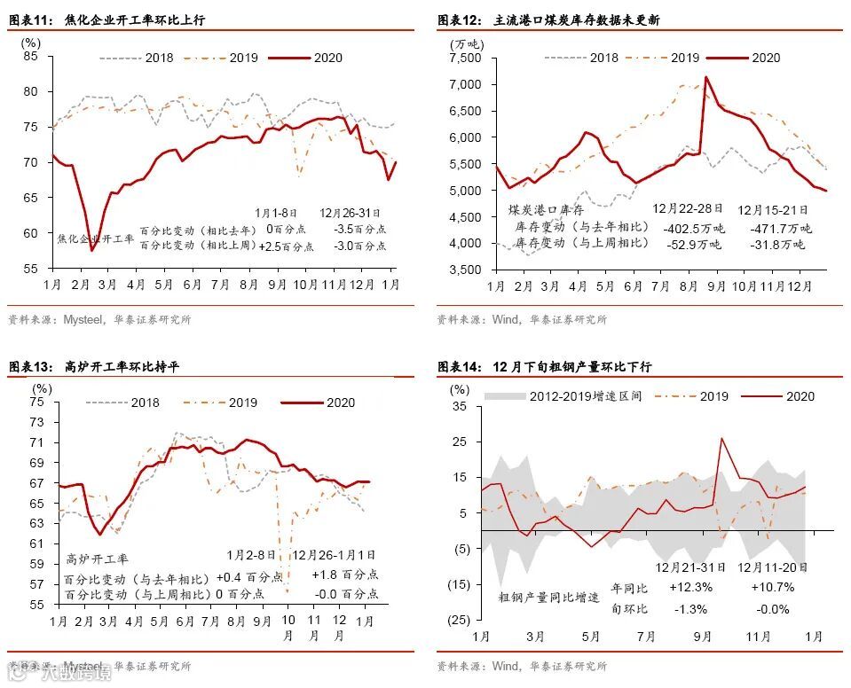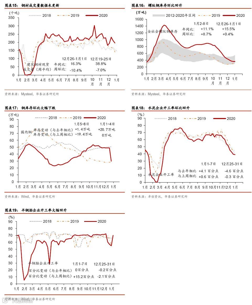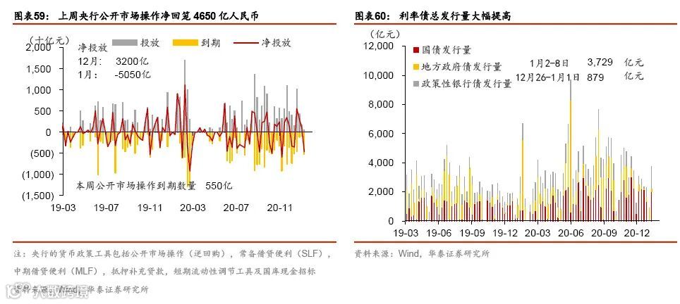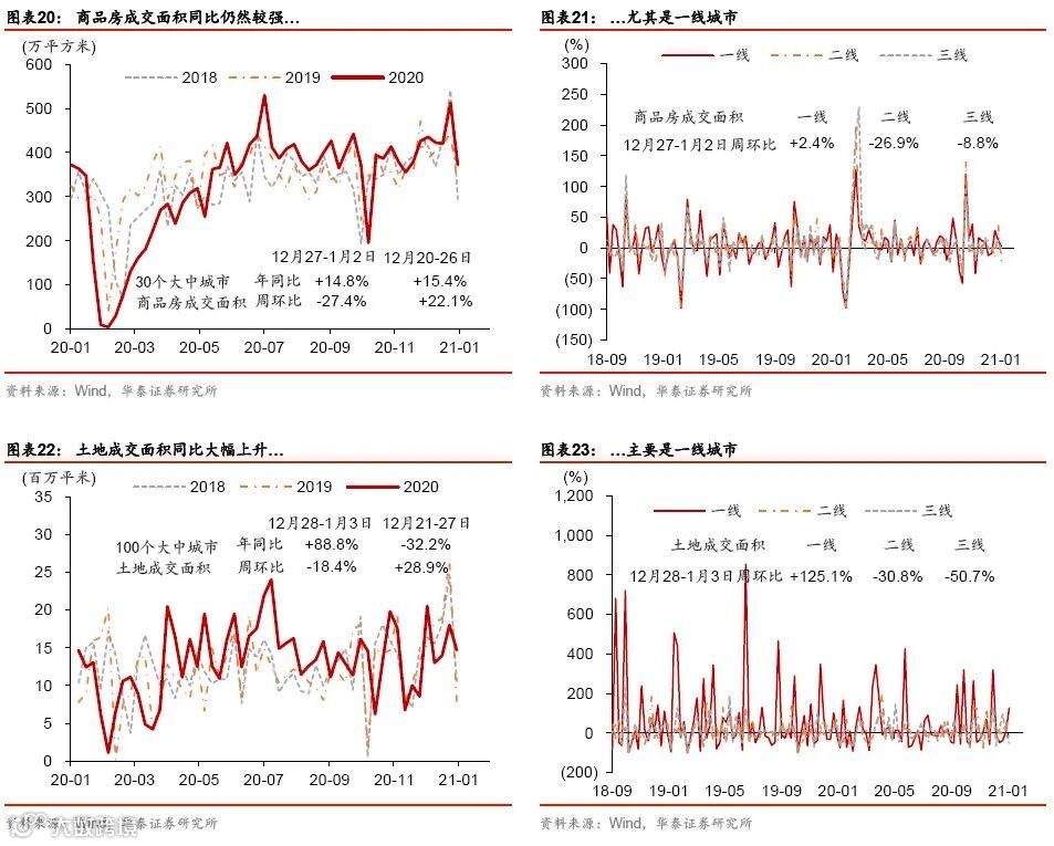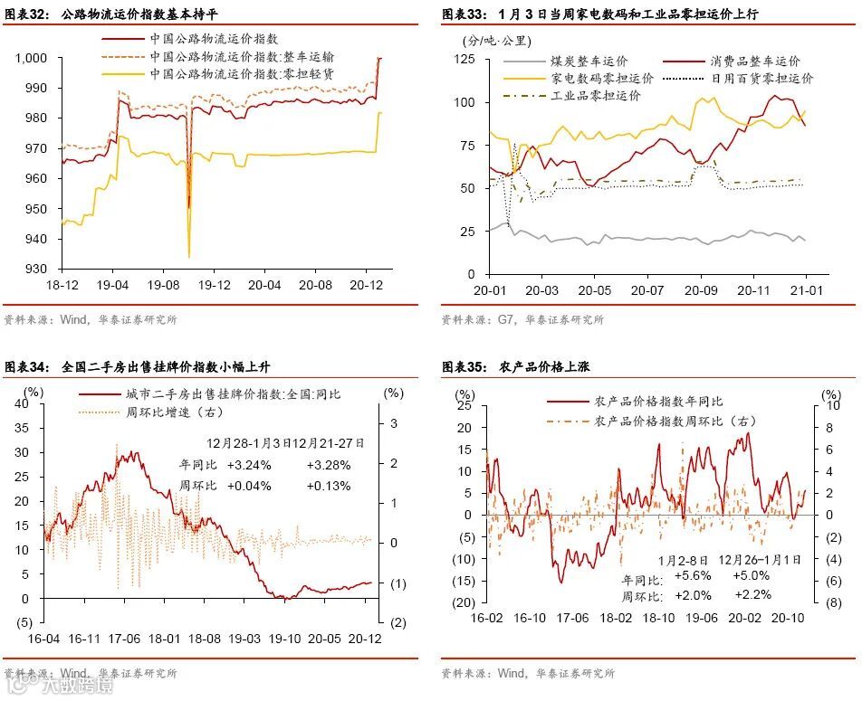 年初消费继续回暖,大宗商品通胀加速上行。元旦以来电影票房较为火爆,且国内航空运输量、运价等指标亦走强。此外,大宗商品价格继续上涨,尤其是寒冷天气推动煤炭价格走高、且疫情阻断河南运力;农产品价格亦持续上扬。房地产市场明显分化,一线城市的商品房和土地成交面积同比均上升,但二、三线城市继续降温。跨年后,流动性仍保持宽松。