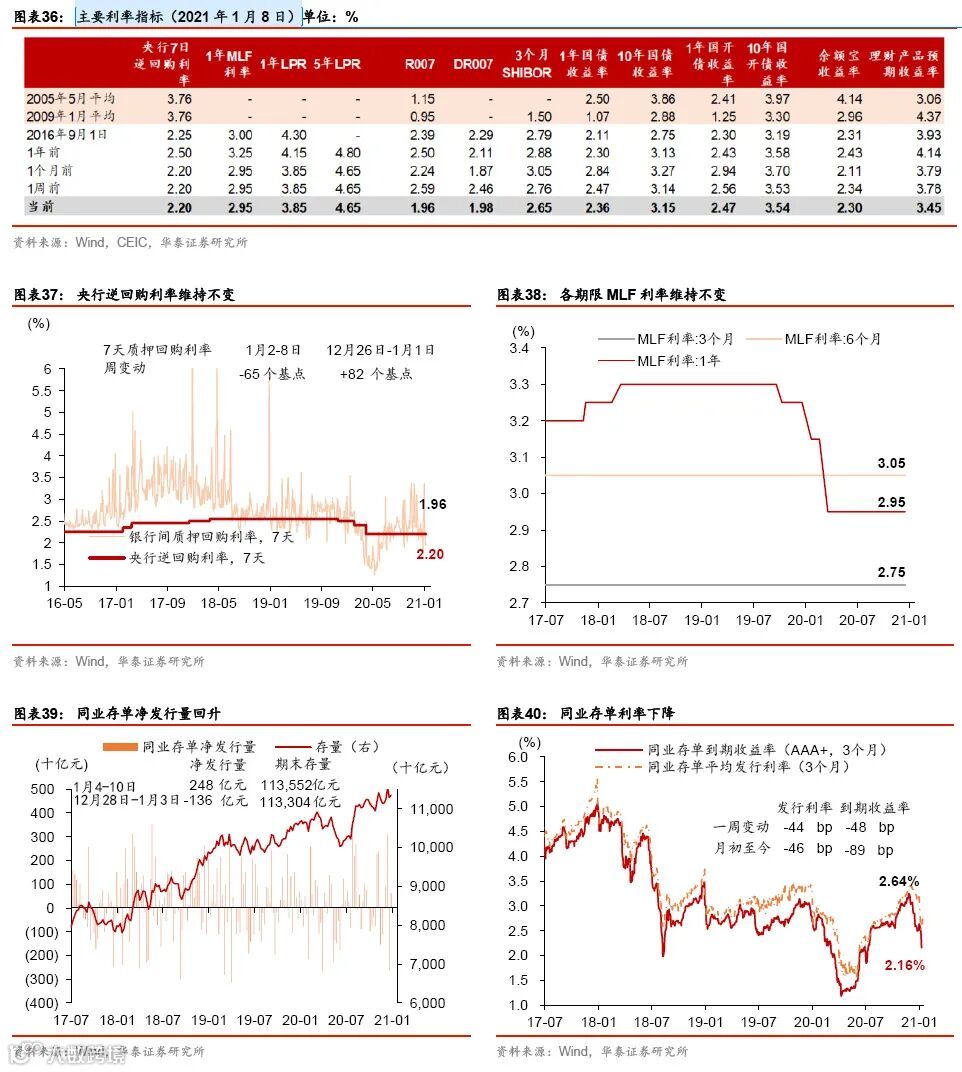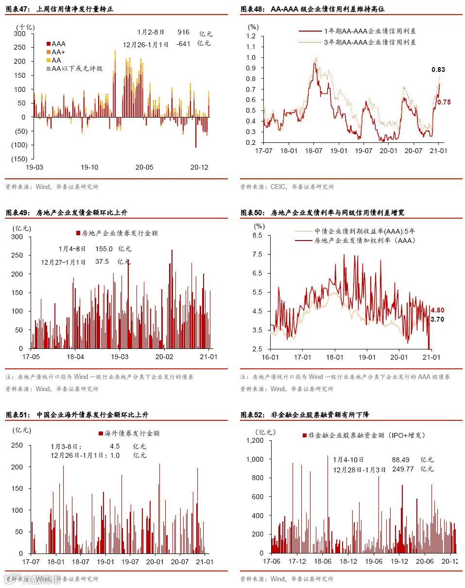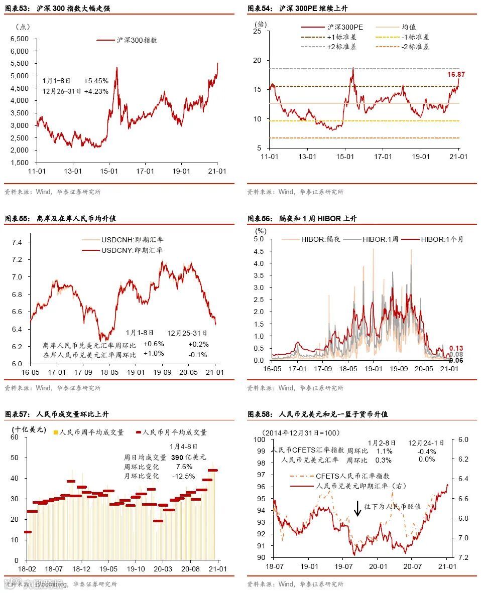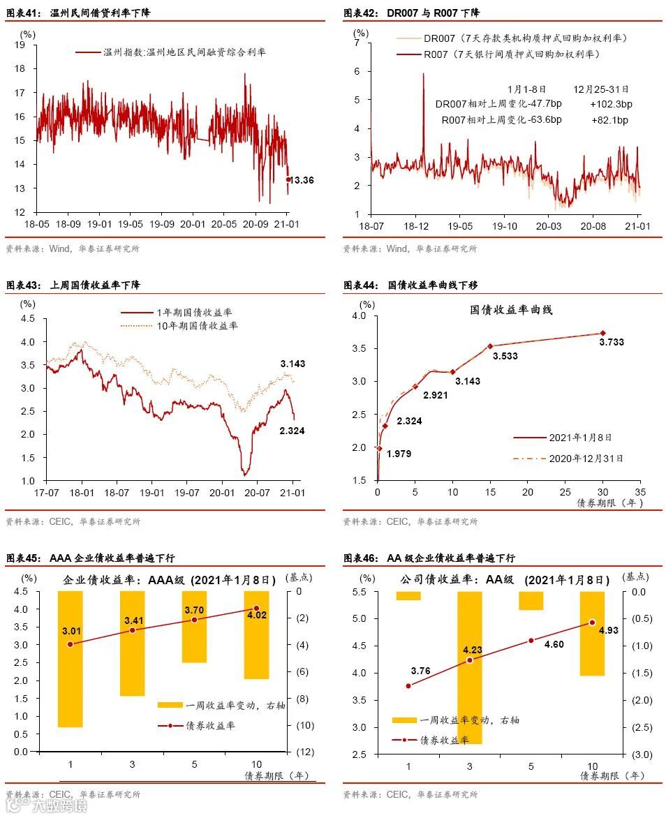 跨年后流动性环境保持宽松。上周央行净回笼4650亿人民币,但各类利率普遍下行:银行间利率大幅回落,R007和DR007分别下降63.6和47.7bp,同业存单利率下降44个bp,1年期和10年期国债收益率分别下降5和29个基点,企业债收益率总体下行。上周信用债和同业存单发行量均有所上升,也是受到流动性环境整体较为宽松的提振。汇率方面,上周人民币加速升值,兑美元小幅升值0.3%,兑一篮子货币升值1.1%,人民币兑美元汇率已升至6.47,回到2018年中水平。