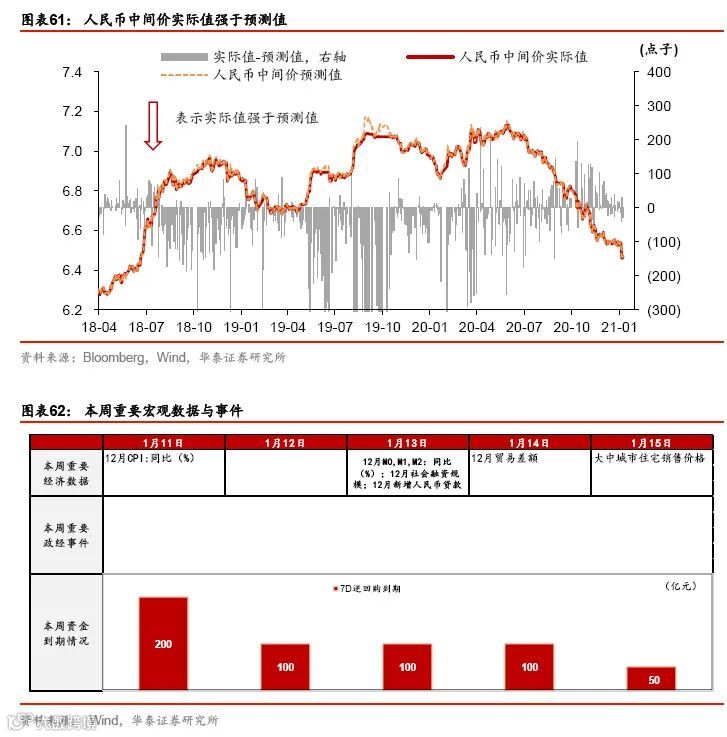 通胀及货币信贷数据发布。12月CPI、PPI将于1月11日公布(我们预计CPI同比零增长,PPI同比-0.5%)。此外,货币投放,社会融资规模,贸易等数据将在本周公布(我们预计12月社融新增2.2万亿元,M2同比10.6%,出口同比26%,进口同比12.5%)。