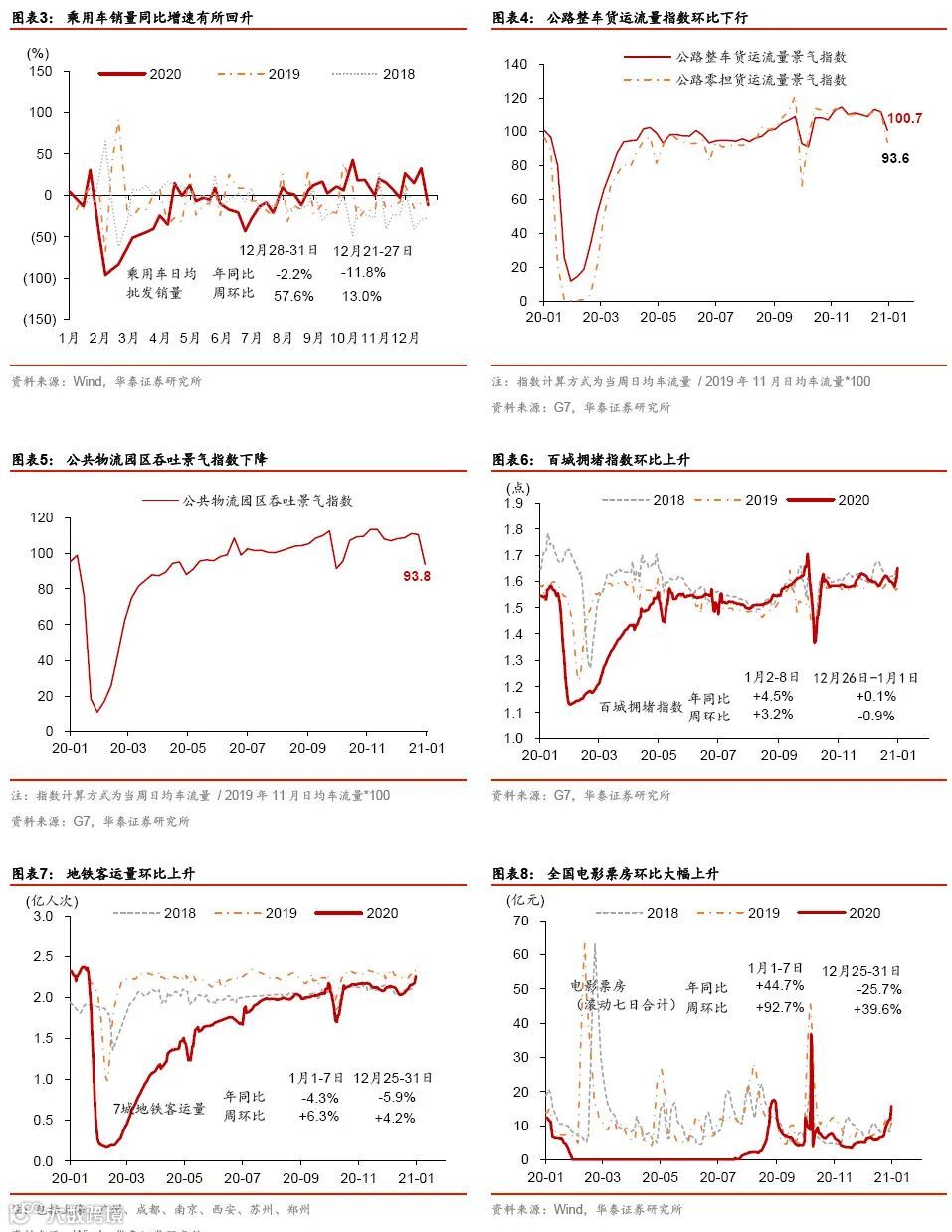 重工业开工淡季回升、消费回暖,房地产市场分化加剧。上周焦化、水泥和半钢胎企业开工率环比回升,高炉开工率环比持平。12月下旬粗钢产量同比增长12.3%。消费方面,国内交通和服务类数据普遍呈增长态势,特别是全国电影票房环比大幅上涨92.7%,且显著高于往年同期(元旦假期整体票房达12.9亿,创历史新高)。12月全月汽车销售亦保持强劲,同比增长7%。另一方面,商品房和土地市场在不同城市间的分化有所加剧:一线城市房地产和土地市场相当活跃,同比显著上升,但二、三线城市成交继续走弱。