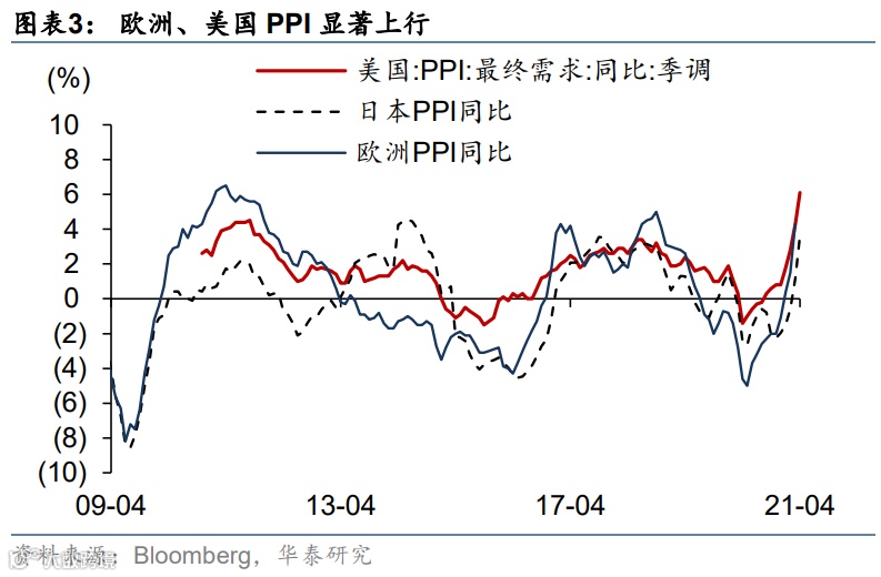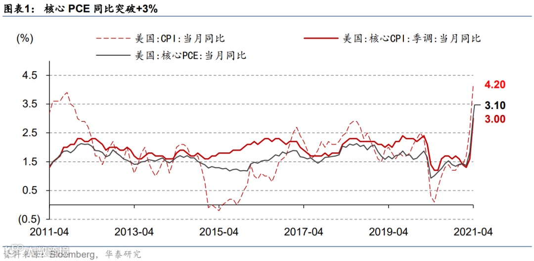 美国4月核心PCE环比+0.7%(前值+0.4%、2001~2019年4月历史均值+0.15%);同比增速上行到+3.1%(前值+1.8%),高于彭博一致预期的+2.8%。4月整体PCE环比+0.6%、同比+3.6%。耐用消费品、电子产品、地产市场、劳动力市场均存在供不应求情况,各类消费和服务价格涨幅较大。居民收入和薪资水平的增长使得通胀上行环境更具持续性。4月核心PCE环比涨幅与两周前公布的当月核心CPI环比基本持平,印证CPI涨幅较高带来的核心通胀“预警”。