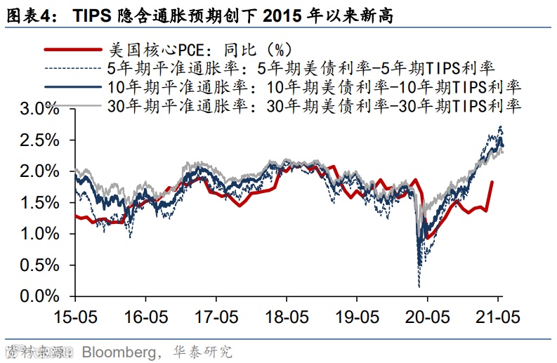 在美国4月PCE数据公布后,10年期美债收益率持平于1.61%,源于4月较高的CPI数据公布后,市场一定程度上已对短期通胀上行幅度有所预期。4-5月份大部分时间美债名义利率曲线均走平,未来名义利率何时再启动上行,主要关注:1)核心通胀上行的“粘性”——即是否能够连续多个月维持在0.5%或以上的环比高增幅;2)美联储对于资产购买边际退出“时间表”的预期引导,资产购买是否可能较预期更快退出。