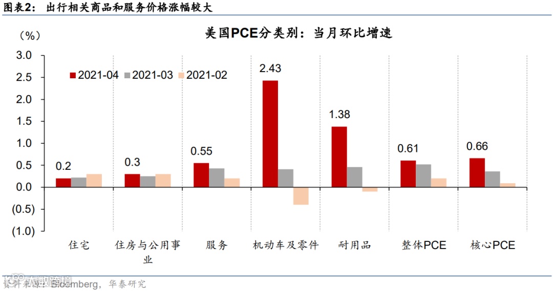 分项来看,4月服务业PCE 当月环比+0.55%、涨幅略低于整体,而耐用品价格环比上涨1.4%、涨幅远高于整体。与出行活动相关的产品/服务价格涨幅最大。机动车及零部件价格上涨2.4%(前值0.4%),交通服务价格上涨3.1%(前值+1.5%)、娱乐服务价格上涨0.75%(前值+0.5%)。住房和公用事业(Housing and Utilities)价格环比+0.3%(前值0.25%)、住宅(Housing)价格环比+0.2%(前值0.2%),两者环比均基本持平前值。