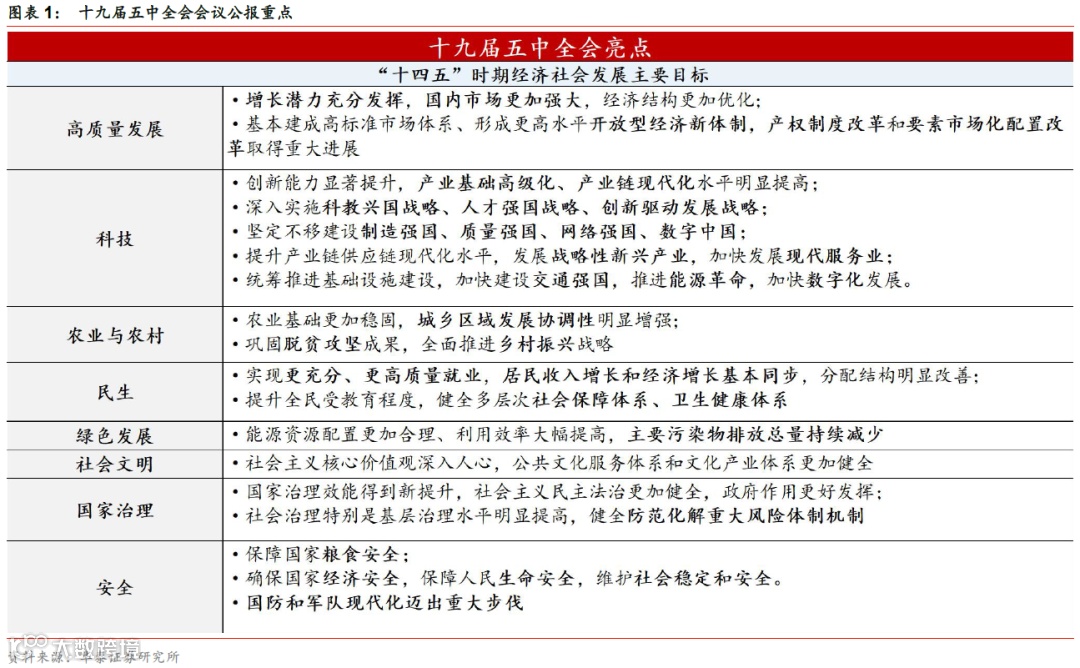 10月29日,十九届五中全会闭幕。会议公报对中国2020年至2035年的中期发展,以及十四五(2021-2025)的发展画下蓝图,展现全面高质量远景,我们在此做简要解读。如此前报告所述,十四五规划建议将于近期公布,此后至明年两会期间,十四五规划中的各项内容将经详细探讨,两会后公布十四五规划总纲。我们将持续关注。
