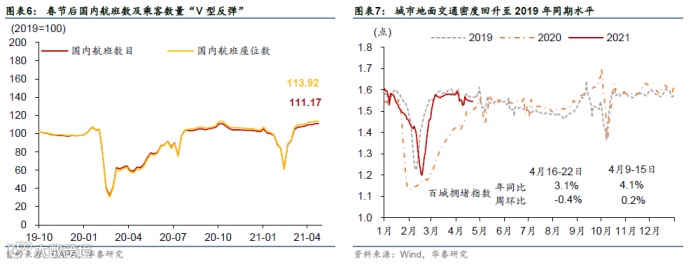实际上,在受疫情短暂扰动之后,春节后消费需求、尤其体验式消费和可选消费已经呈现加速复苏态势。以2020-2021两年一季度的复合年增长率(即CAGR)衡量,相比1-2月,3月已经有不少可选消费品类零售额明显加速,特别是旅游和线下服务业/体验式消费及相关可选消费,如餐饮、珠宝、化妆品、汽车、服装等。同时,前期商品房销售强势,也带动家居家装产业链景气度继续上升(图表4和5)。我们在2021年1月26日发布的报告《国内局部疫情反复影响几何?》中提到的,春节前后局部地区疫情反复压制消费需求,导致春运客流量较2019年同期下降71%。春节后出行需求逐渐恢复,至4月初,清明小长假旅客出行人次已恢复至接近2019年水平(图表2)、而旅游支出仍相对较弱。同时,高频数据显示春节后国内航班数和上座率都出现“V形反弹”,同时上座率(即产能利用率)增长更快、票价亦水涨船高。数据显示,当前国内航班数量已回升至2019年平均水平的111%,而总乘客数于已经超过2019年均水平14%(图表6)。与1-2月相比,3-4月出行活跃度继续上升,此间周均航班数环比增长19.7%,乘客数增长21.3%。此外,市内交通活跃度亦回升至2019年同期水平(图表7)。总体而言,近期零售、交通和旅游预售数据均表明可选和体验式服务消费(尤其是高端消费)需求回升空间将更大。