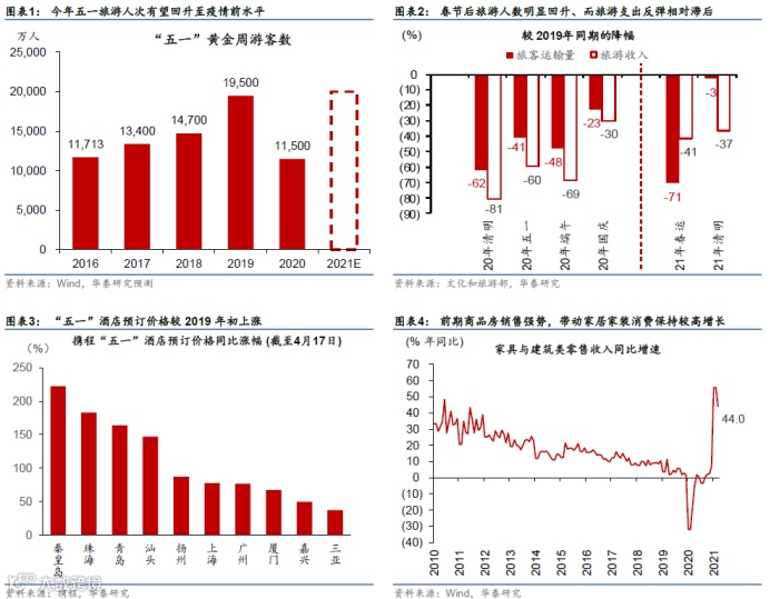 国内消费需求可能在接下来几个月加速“补缺口”,且短期内宏观调控及金融资产价格波动对消费反弹趋势的影响较小。总体而言,春节后国内外疫情防控形势向好、疫苗接种加速,带动体验式服务及可选消费需求反弹。此外,体验式服务及可选消费需求有强顺周期属性——此前疫情持续压制消费倾向,导致其本轮复苏相对其他周期性行业的时滞被强制拉长,居民部门超额储蓄大幅攀升。随着疫情、总体宏观环境和储蓄率逐步“正常化”,此前居民部门累积的超额储蓄将逐渐释放。又一个“旅游旺季”将随着五一的到来拉开序幕,疫情变化之外,几大因素有望“共振”,提振线下服务业及相关可选消费需求: