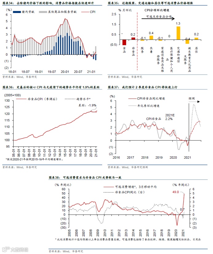 同时,线下服务业和可选消费需求回升,或将推升核心通胀水平。我们预计2季度国内核心通胀水平将快速回升,同时、我们维持对2021年四季度非食品CPI平均 3.5%-4%的预测。消费需求回升将推升相关行业的产能利用率及通胀,其中线下服务和可选消费领域将最为显著。虽然3月CPI同比仅录得0.4%,略低于市场预期,但猪肉以外的CPI分项同比及环比普遍显著回升(图表34),服装、交通运输和居住等可选消费品价格领涨(图表35)。定基后的核心CPI与无疫情下的趋势水平仍有1.9%的差距,这与线下服务和可选消费复苏滞后的现状也是一致的(图表36)。我们预计2季度非食品CPI将快速上行,主要受去年同期低基数、以及可选消费环比强劲复苏的共同推动(图表37和38)。由此,短期内财政和货币政策宽松的概率不高。相应地,PPI和非食品CPI通胀的快速上升将对利率中枢的进一步下行构成制约。